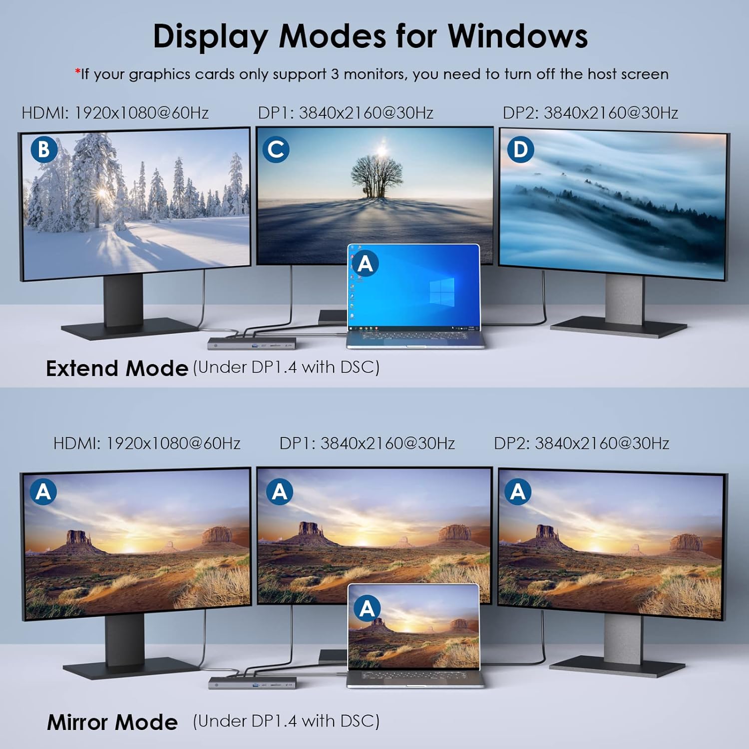 - 【Pls Note】Windows OS supports mirror and extend mode; Mac OS supports the mirror mode and non-mirror mode, but not the extend mode. (Non-mirror: same for all three external monitors, but different from host laptop display)