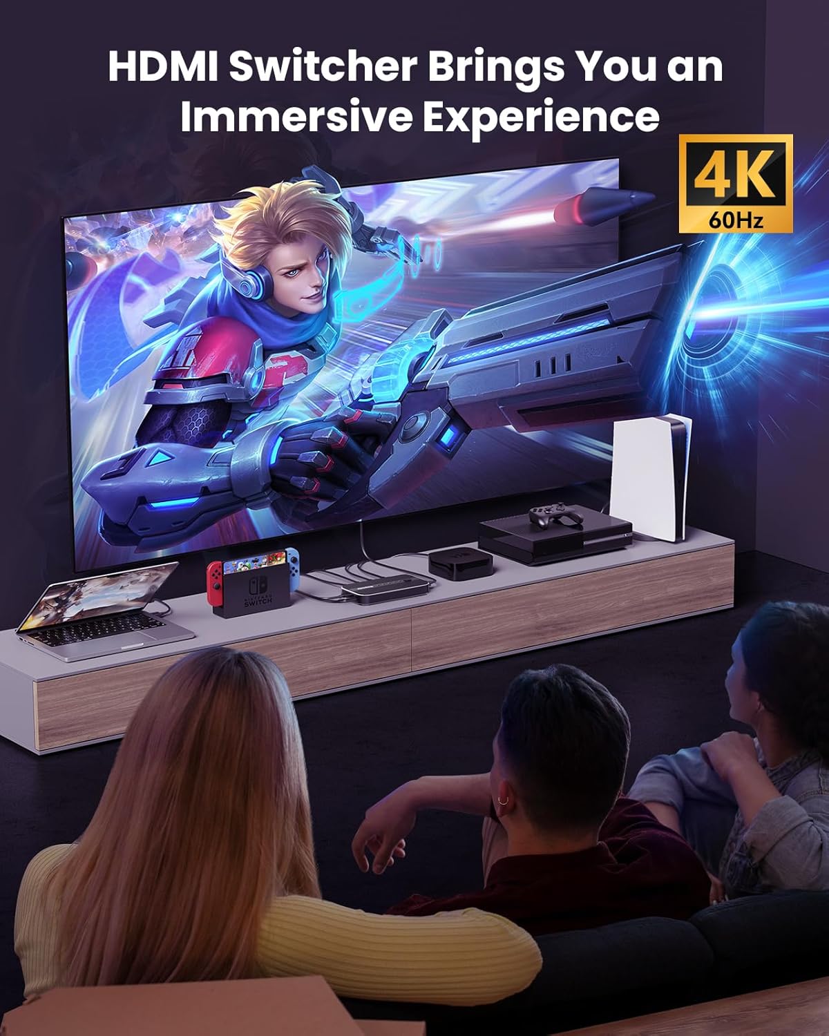 - 【Wide Compatibility】Supports most HDMI devices:PC, Laptops, Xbox 360, PS3/PS4/PS5, Roku Express, Amazon Fire TV Stick, Blu-ray DVD, Game Consoles etc; 5 way hdmi splitter Output: Full HD TVs, projectors, monitors and more.