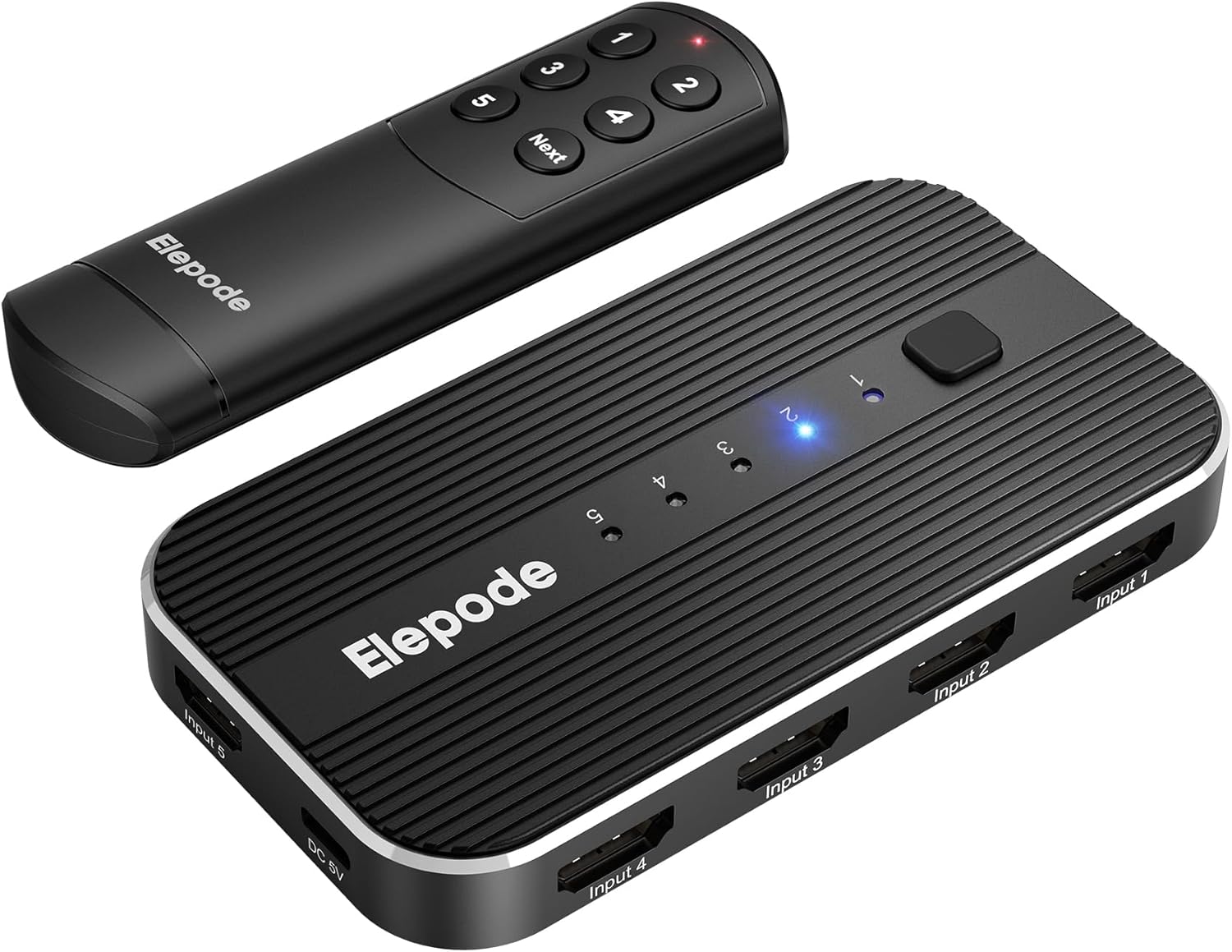 HDMI Splitter with Remote, 5 in 1 Out 4K@60Hz Elepode HDMI Switch, HDMI 2.0 Switch Box Hub for 3D, HDCP2.2, HDR, Compatible with Xbox, PS5/4/3, Fire Stick Roku Blu-Ray Player
