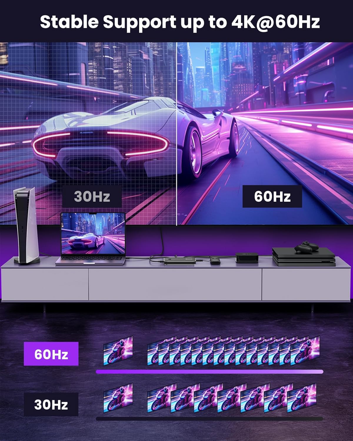 - 【4K@60Hz High Definition Resolution Image Display】5 Ports HDMI Hub support HDMI Output Video:4K@30Hz, 25601440@120Hz, and 19201080@240Hz. Perfectly adapted to 3D, UHD, and HDCP2.2 signals. Provide you with a visual feast and an amazing gaming experience.