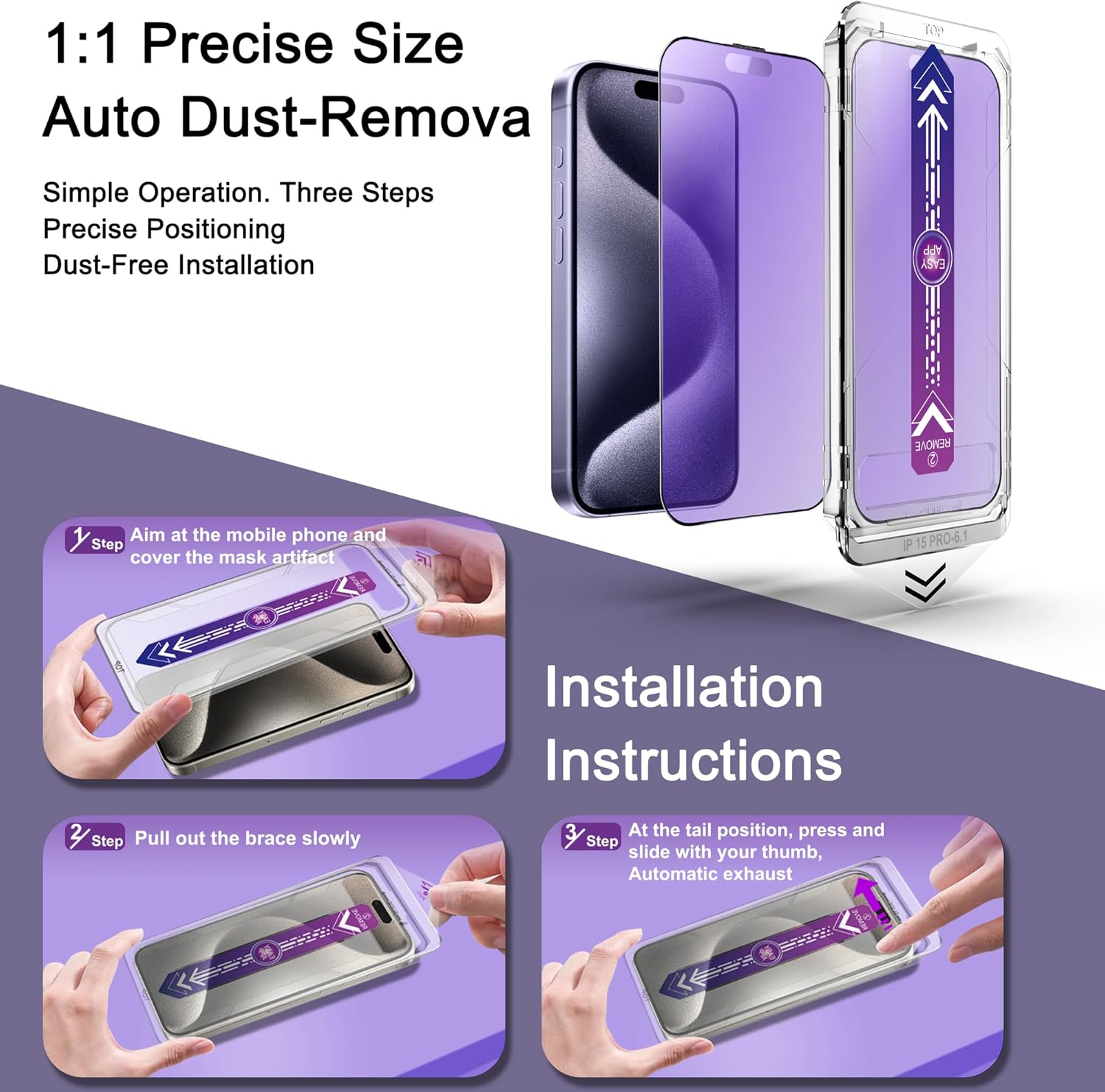 - Auto Dust Removal & Easy Alignment: This iPhone 15 Pro screen protector is designed with advanced auto dust removal and self-aligning technology to ensure a flawless,bubble-free installation every time. Simply place the alignment frame on your phone,pull the tab gently,then press and slide to push out any remaining air. The process is quick and hassle-free. For the best results,we recommend watching our step-by-step installation video before getting started