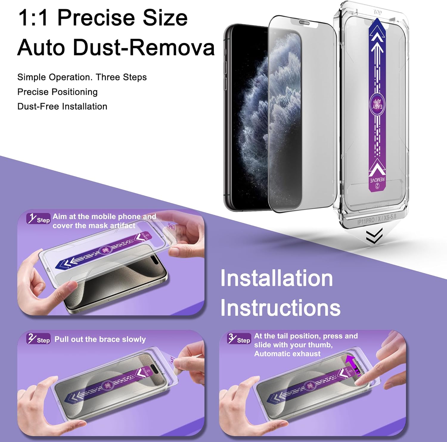 - Auto Dust Removal & Easy Alignment: This iPhone X/iPhone XS/iPhone 11 Pro screen protector is designed with advanced auto dust removal and self-aligning technology to ensure a flawless,bubble-free installation every time. Simply place the alignment frame on your phone,pull the tab gently,then press and slide to push out any remaining air. The process is quick and hassle-free. For the best results,we recommend watching our step-by-step installation video before getting started