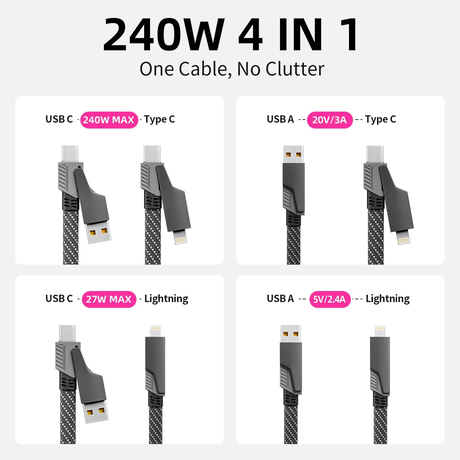 - 4 in 1 USB Charging Cable : This 4-in-1 USB-C fast charging cable covers all your charging needs with 1 USB-A port, 1 Light -ning port, and dual USB-C connectors cable. Compatible with almost all devices, one for all, no more need for other cables.