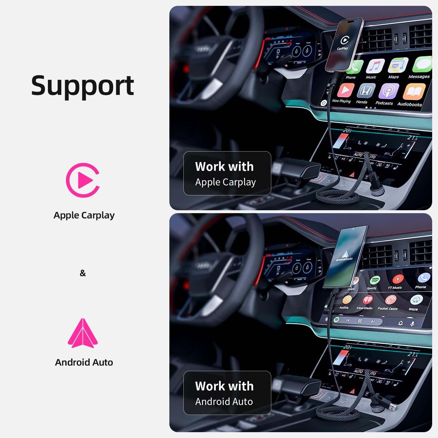 - Support Carplay & Android Auto : This dual head type c 4-in-1 multi charging cable can work with carplay and Android Auto, allowing you to charge and navigate simultaneously. All Port Support Data Transfer, and the data sync speeds up to 480Mbps.Transfer a 1G file in just 30 seconds (Video/media output not supported).