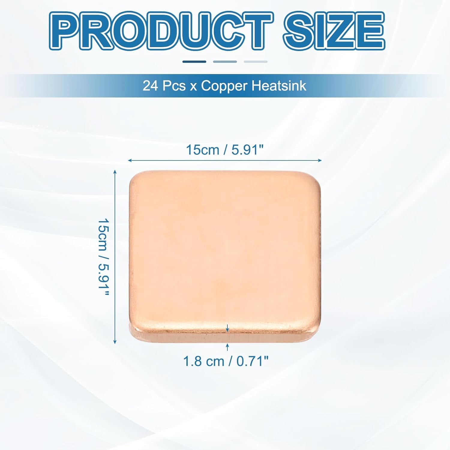 - Color: Copper Tone; Material: Copper; Size: 15 x 15 x 1.8 cm / 5.91 x 5.91 x 0.71 Inch (LxWxT); Package List: 24 Pcs x Copper Heatsink