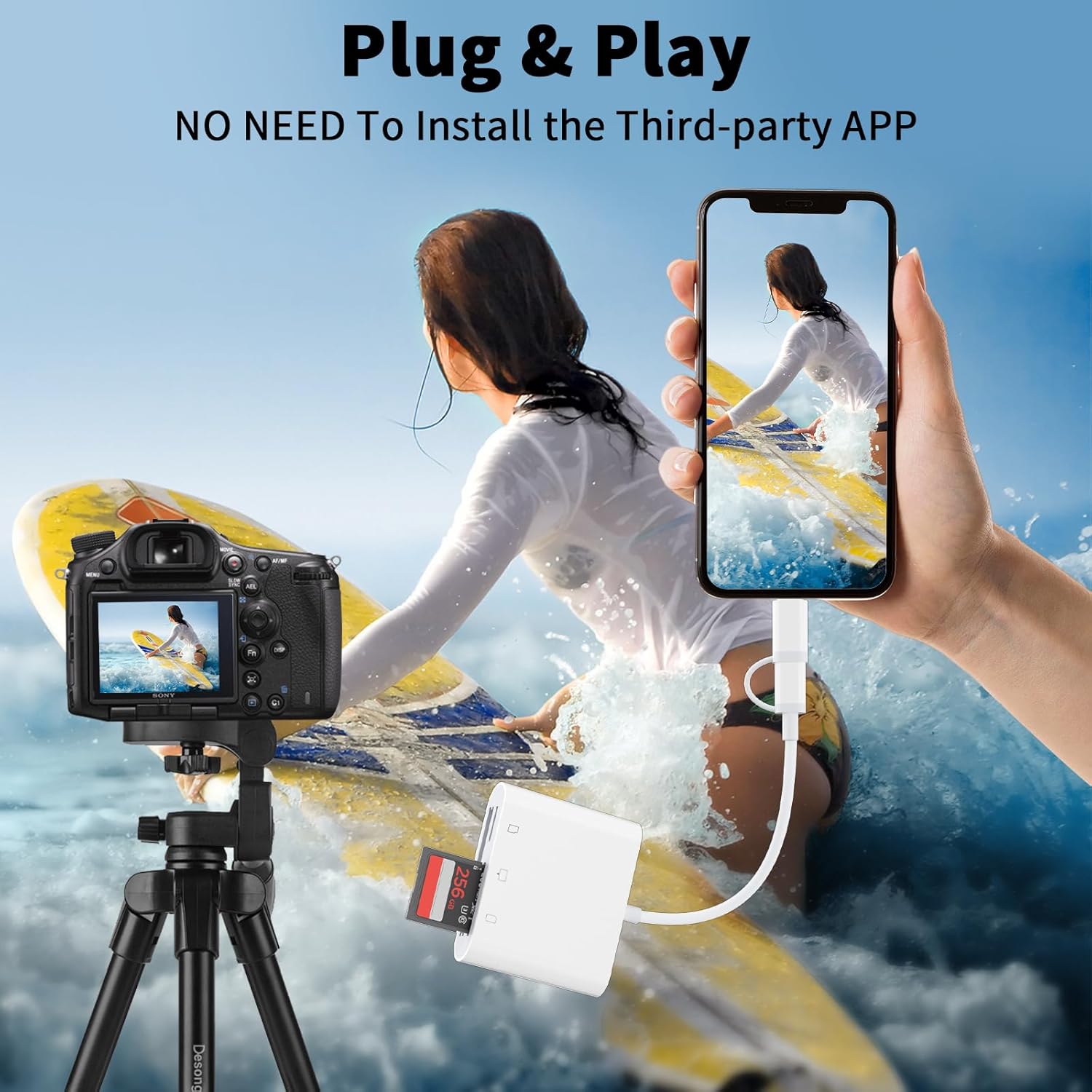 - Reliable and Portable: The integrated USB Type-C and Lightning connectors are attached, eliminating concerns about misplacing them. With its lightweight design and miniature size, this adapter for digital camera to phone minimizes damage while ensuring reliable performance, making the memory card adapter a reliable tool for travel, vacations, and spontaneous photography adventures