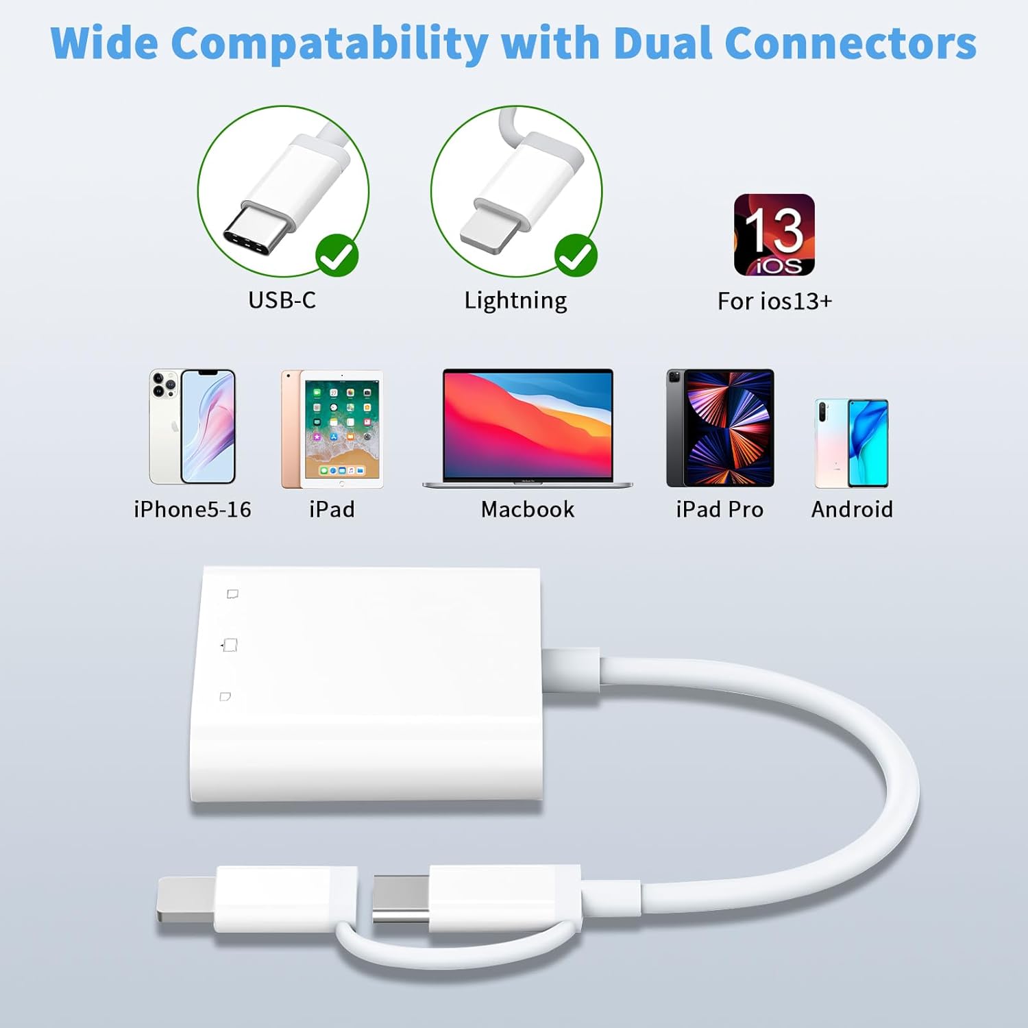 - Lightning&USB C SD Card Reader: The Aplimln SD Card Reader for iPhone features dual interfaces, including a USB-C connector and an extra Apple MFI certified Lightning interface, ensuring compatibility with a wide range of devices, such as iPhone 5-16 (ios 13+), iPad, MacBook, Android Phone/laptop and other type c devices. Please note that both connectors can not be used simultaneously