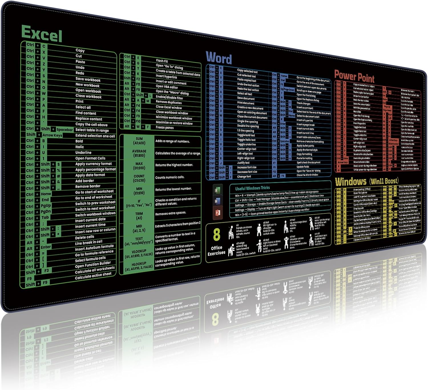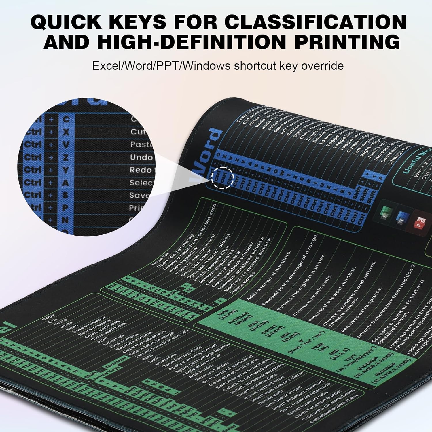 - BOOST PRODUCTIVITY WITH BUILT-IN SHORTCUTS: Color lable all-in-one hotkeys for Excel, Word, PPT, and Windows are clearly printed on the mousepad. No more fumbling with complex key combinations—beginners can learn quickly, while pros stay focused and efficient, reducing workflow interruptions.