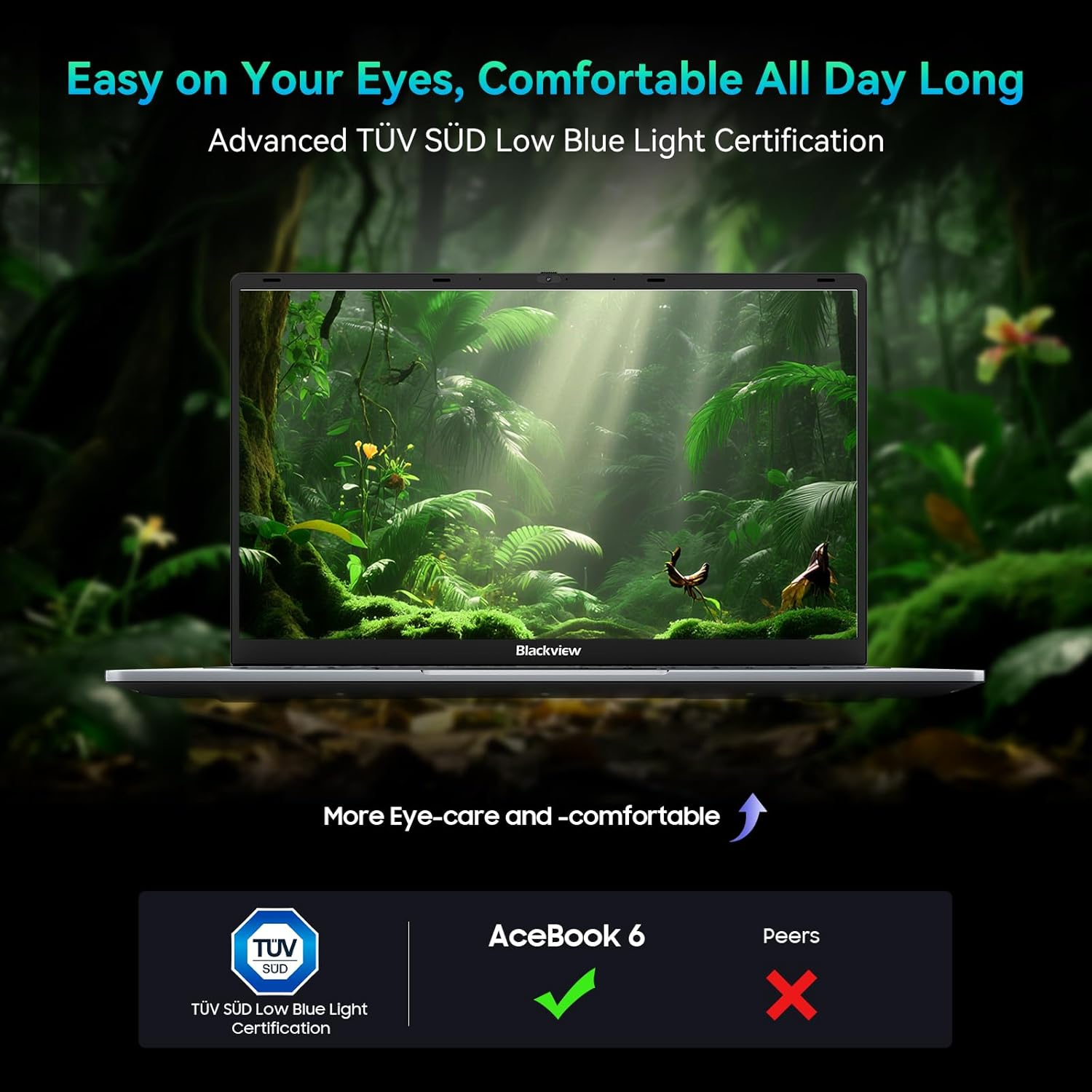 - 【Perfect Back-to-School Gift & Daily Use】Whether back-to-school season or daily life, Blackview Acebook 6 laptop fits seamlessly—ideal for students, remote workers, or anyone needing reliability. For students, its 15.6" TÜV eye-care display eases long study sessions; 16GB RAM handles notes, research, and courses effortlessly. Lightweight and compact, it slides into backpacks for campus or commutes. Beyond school, it excels at work, streaming, and more—practical year-round. Sleek and functional, it’s a thoughtful gift for anyone seeking efficiency and portability, no matter the season.