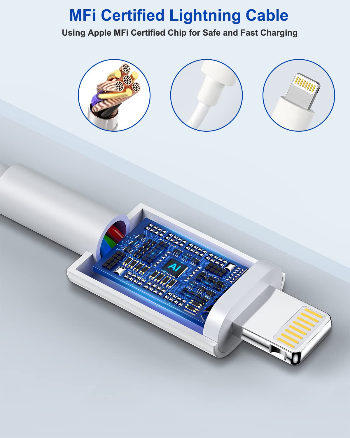 - 【2Pack Safety Efficient Fast Charger & 2Pack Long Apple Charger】2set iPhone Fast Charger Compliant with UL safety standards, this iPhone charger comes with a wide range of safety features.The iphone charger block is sturdy enough to prevent scratches, collisions and drops, while the lightning cable has been lab-tested to withstand 10,000 bends without breaking.