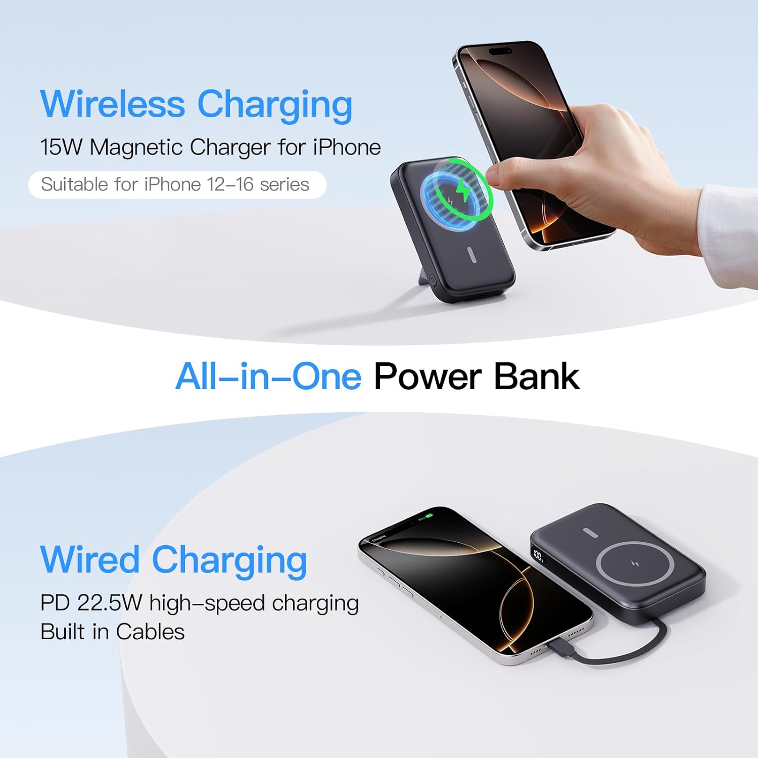 - 【Powerful 15W Magnetic Wireless Power Bank】 This portable magnetic battery pack is designed for iPhone 16, iPhone 16 Plus, iPhone 16 Pro, iPhone 16 Pro Max, iPhone 15, iPhone 15 Plus, iPhone 15 Pro, iPhone 15 Pro Max, iPhone 14, iPhone 14 Plus, iPhone 14 Pro, iPhone 14 Pro Max, iPhone 13, iPhone 13 mini, iPhone 13 Pro, iPhone 13 Pro Max, iPhone 12, iPhone 12 mini, iPhone 12 Pro, and iPhone 12 Pro Max. Note: We recommend charging with MagSafe phone case or without cases to get enough suction for better grip.