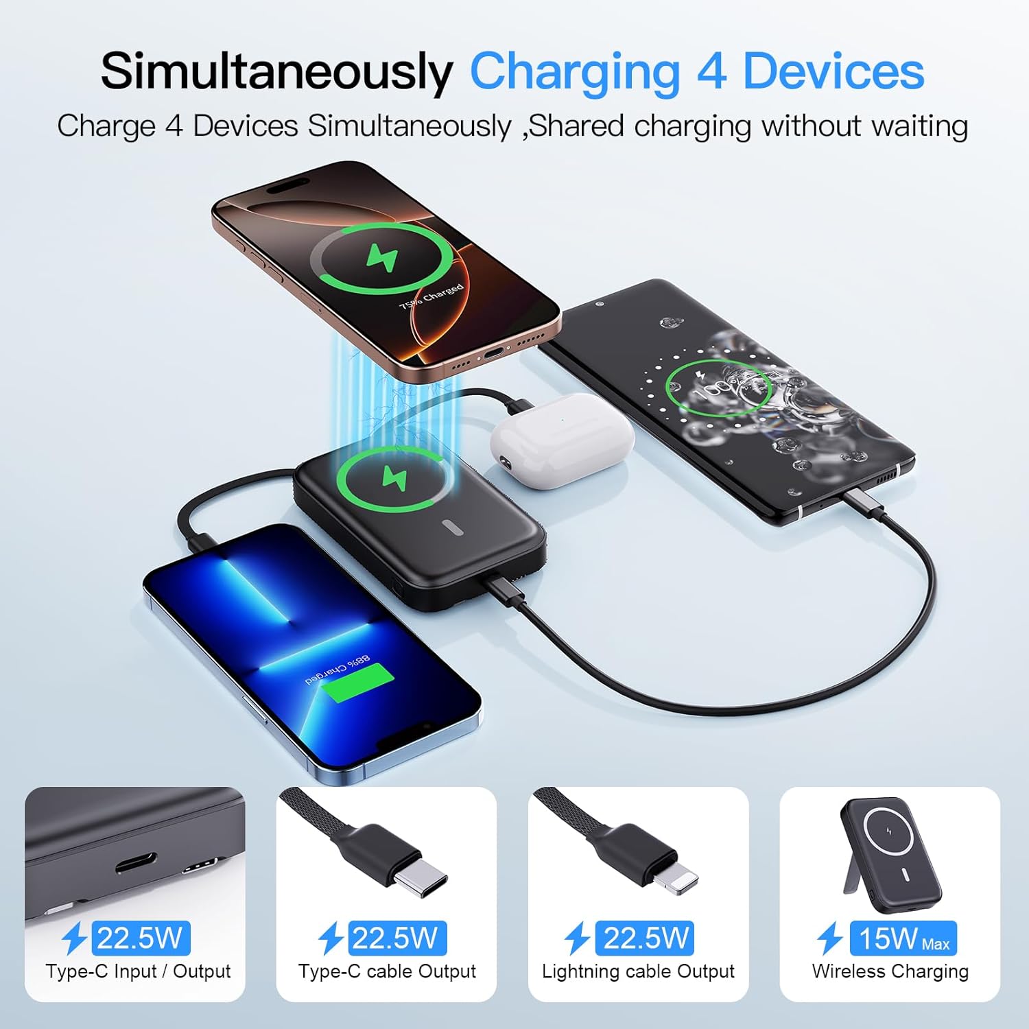- 【4 Output Simultaneously】 This Portable charger power bank is designed with 4 output method. 2*USB C output, 1* Magnetic wireless output and 1* IOS output. It supports 4 devices charging max simultaneously, no more cluttered charging adapters or cables on your desk now. A best portable charger for all people!