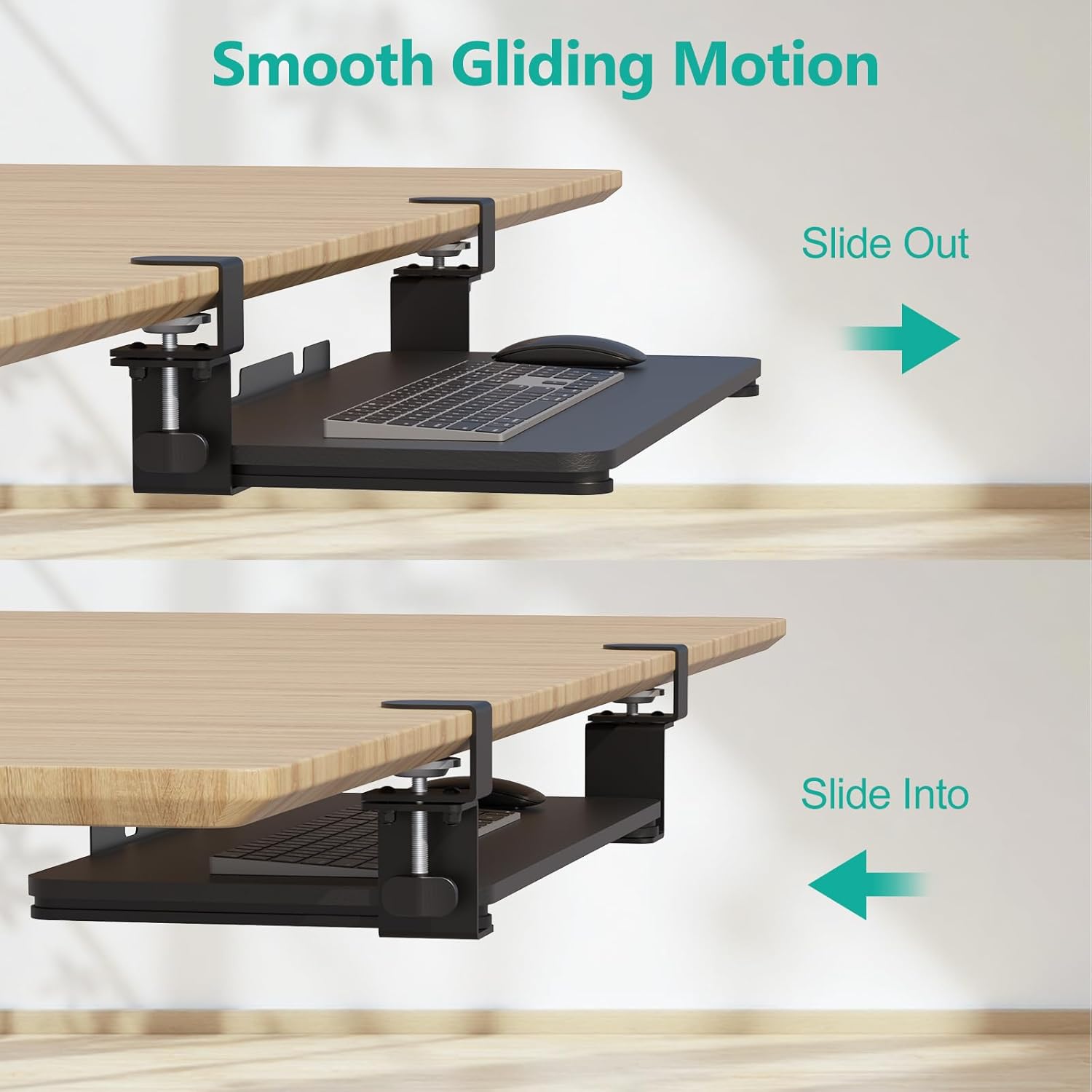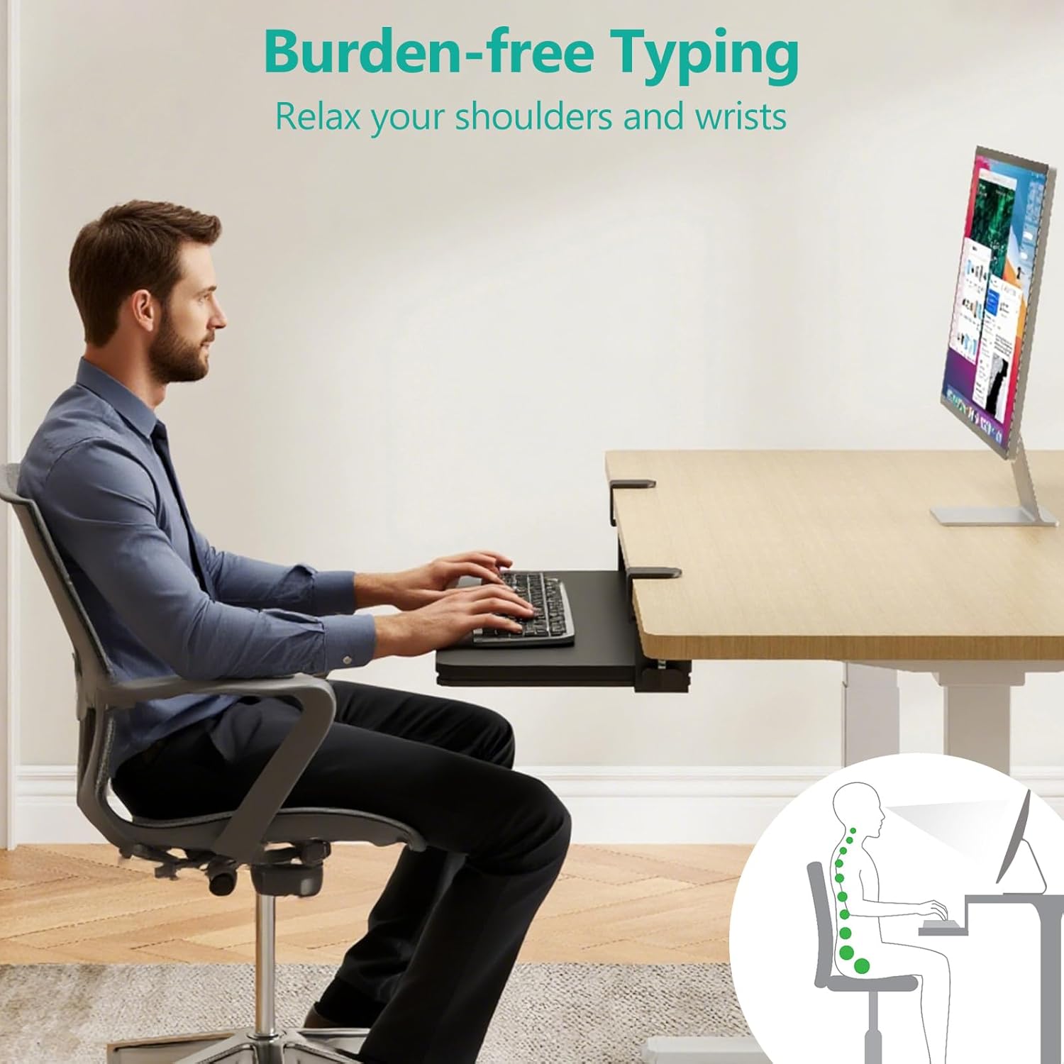- Smooth Glide Motion: Easily slide tray in and out and enjoy ergonomic typing angles that relieve stress on your wrists and shoulders, under-desk keyboard tray features a smooth pull-out mechanism using our ball slide-way system, preventing it from accidentally sliding out when fully hidden