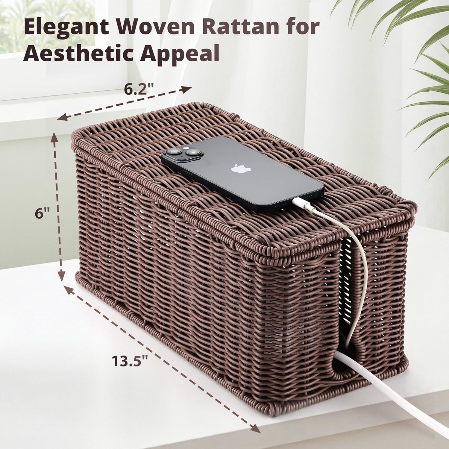 - Sturdy & Stylish Construction: Featuring a coated metal frame and neatly woven synthetic rattan, this wire organizer combines durability with style. It has two sided strategically placed open slots for easy cord management and convenient charging access, keeping your space tidy and organized. Note: This cable box has been upgraded to remove the back hole