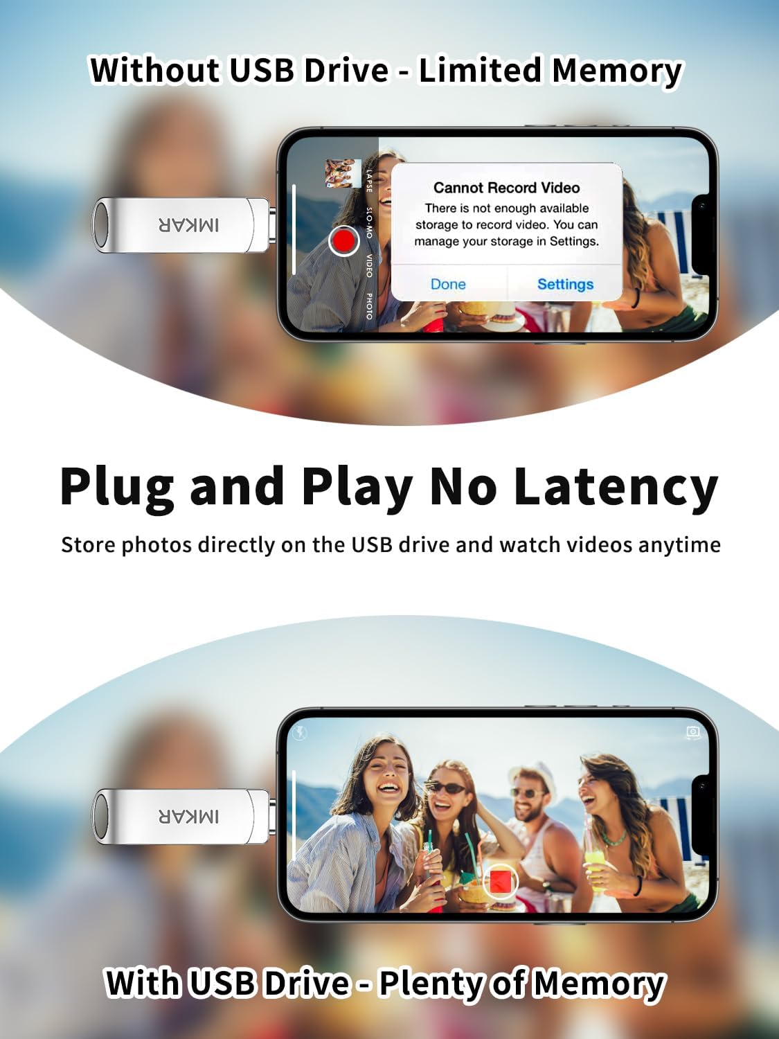 - 【Watch Movies, Photos and Play Music Directly From Phone Flash Drive】Store your favorite videos, audios and music on your iPhone's Photo Stick, then seamlessly plug and play on your iPhone or iPad anytime, anywhere. No more need for Internet or WiFi. This iPhone storage device plays videos in many different formats. Pictures stored on the Phone storage device also support different formats. Great way to store all your pictures and videos on an phone external storage device.