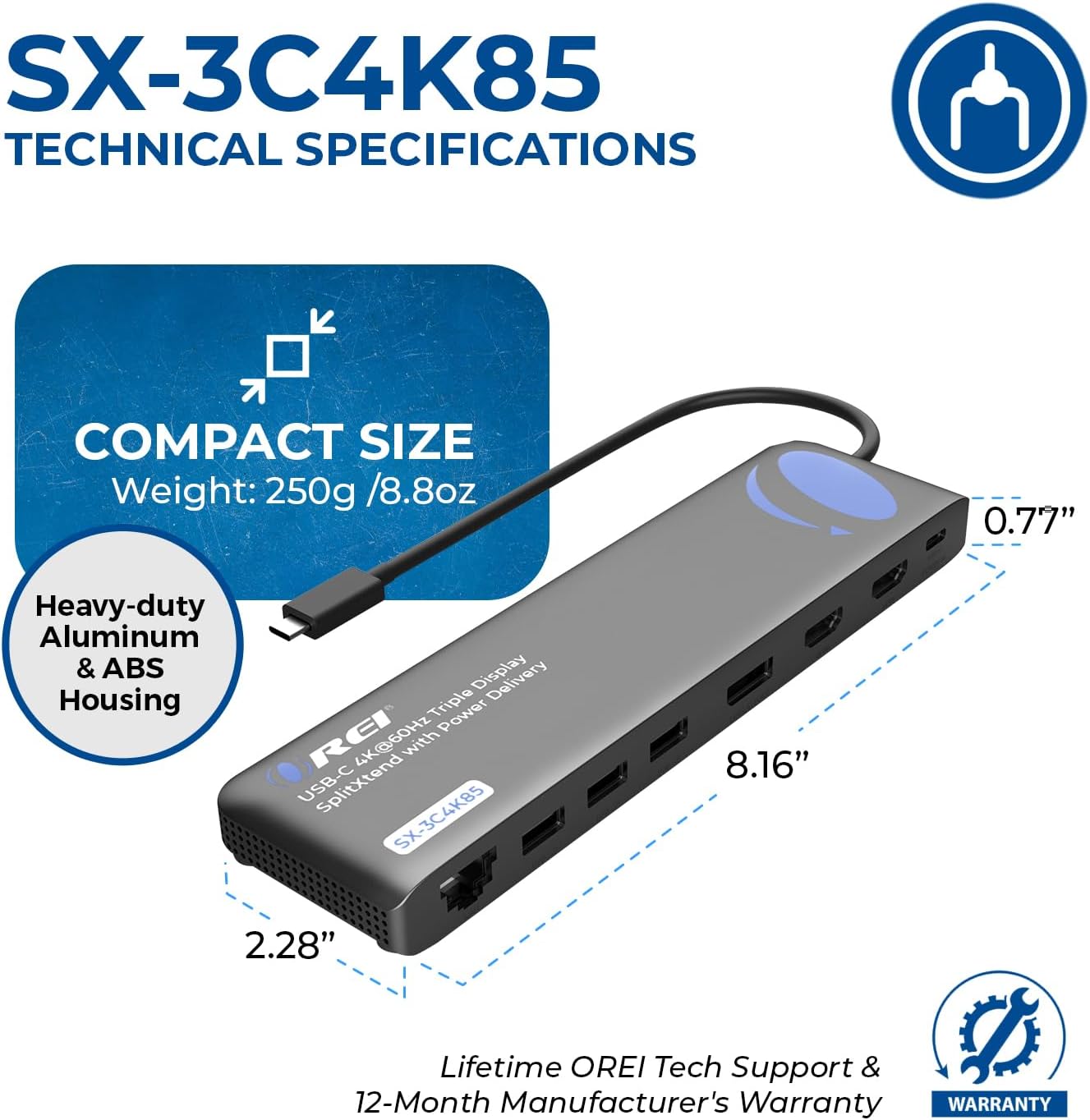 - Compact, Travel-Ready Design – Lightweight, portable adapter fits easily in any laptop bag for on-the-go productivity; backed by a full 1-year warranty and lifetime OREI support; includes SplitExtend SX-3C4K85 and user manual.