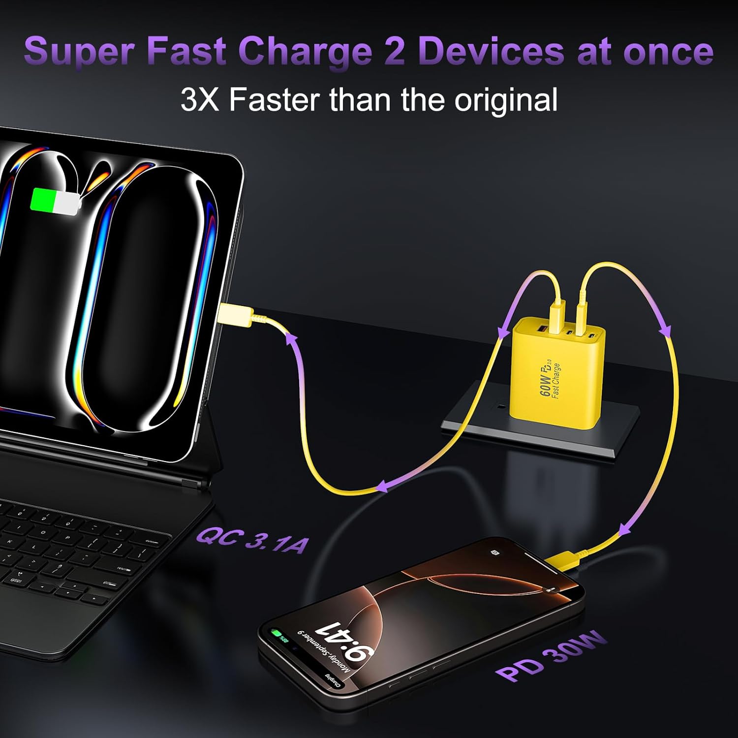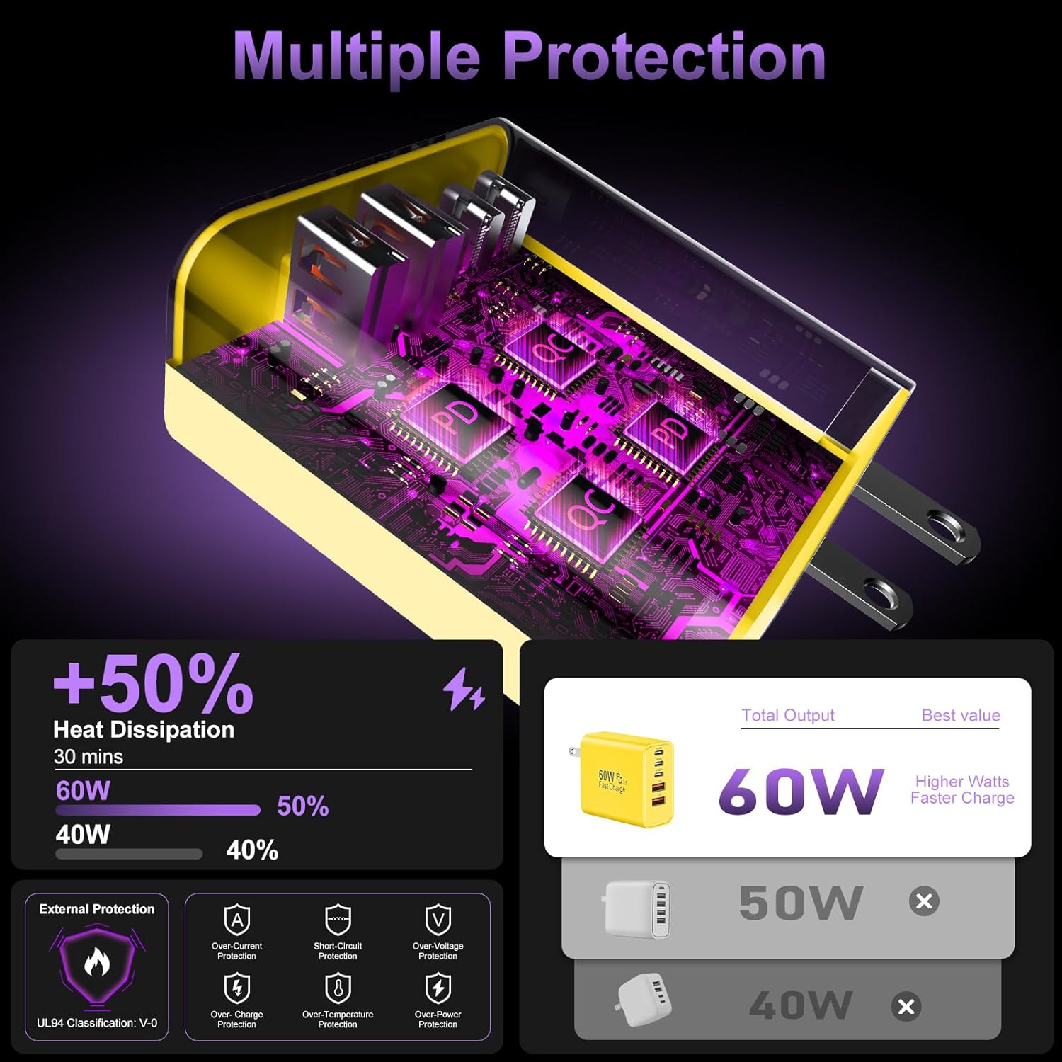 USB C Fast Wall Charger Block, 2Pack 60W USBC Charging Cubes, 5-Port PD+QC Power Adapter Multiport Brick Type C Box Plug for Phone 16/15/14/13/12/11/Pro Max/Plus, Pad Mini/Pro/S25/S24-Yellow
