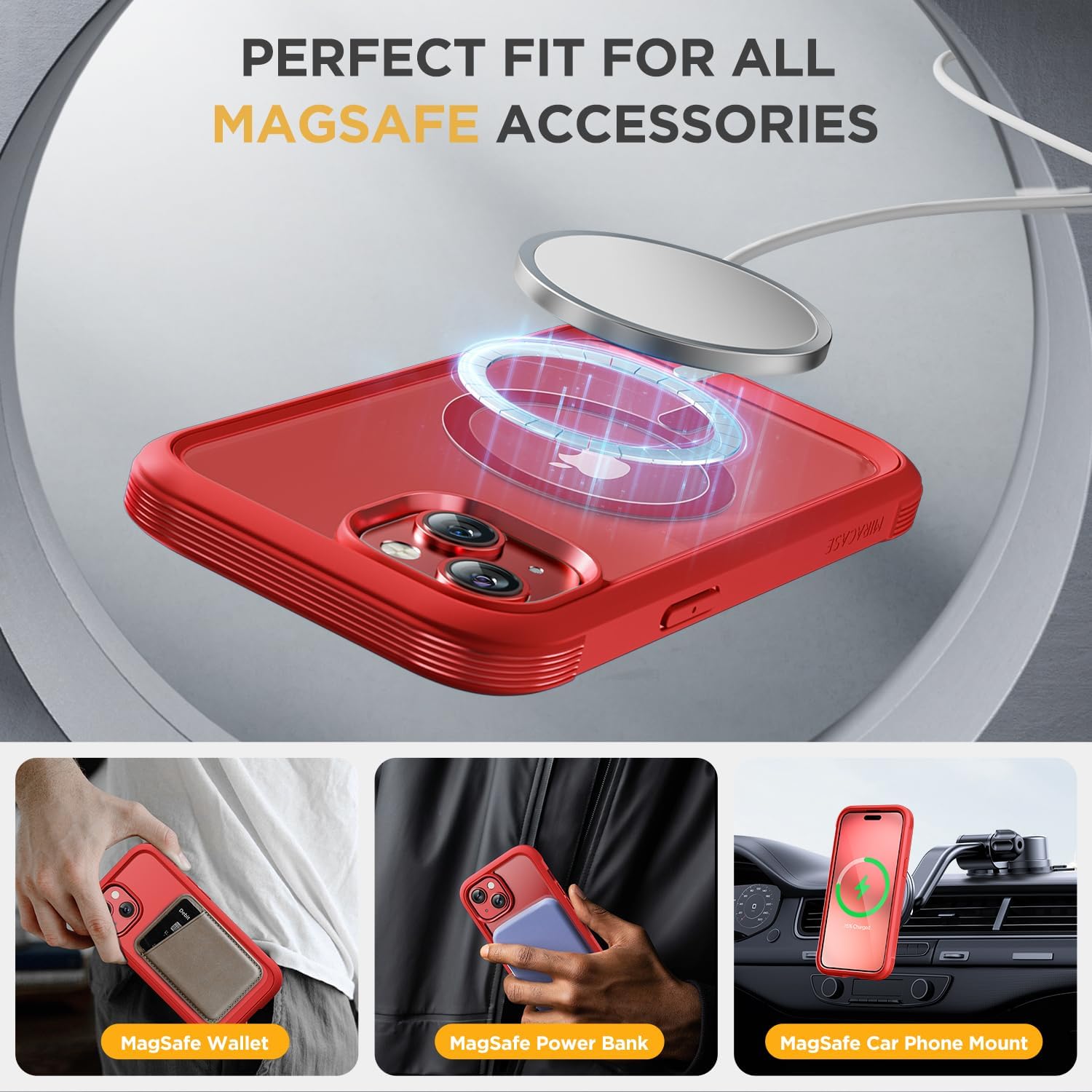 Miracase Magnetic for iPhone 14 Case 6.1", [Built-in Tempered Glass Screen Protector + Lens Protector] [Compatible with MagSafe] Full-Body Protective Bumper 14 Phone Cover, Red