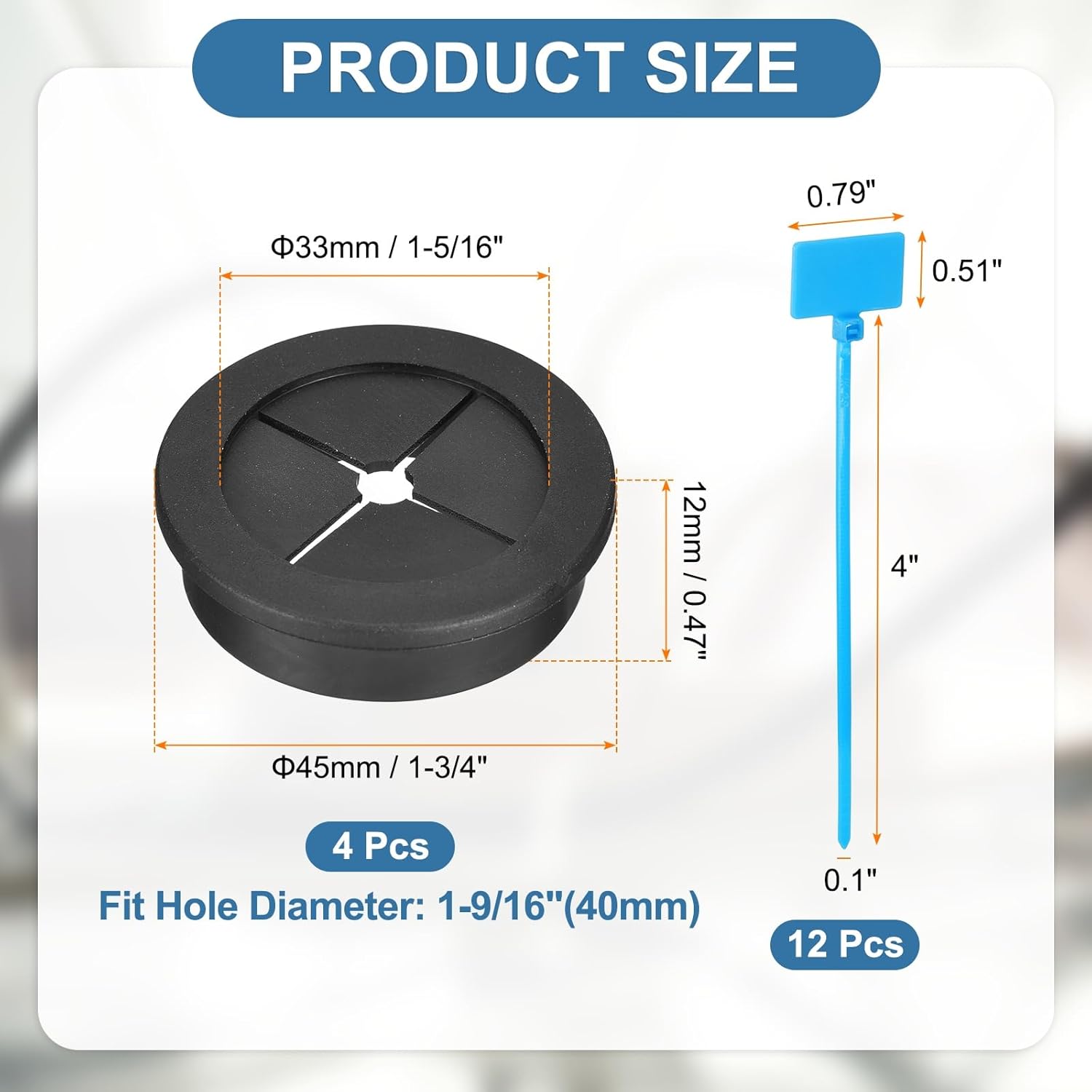 uxcell 4Pcs Cable Cord Grommet, 1-9/16"(40mm) Rubber Desk Grommets Wire Pass Through Hole Cover with Marked Cable Ties for Home Office Cable Wire Protection, Black