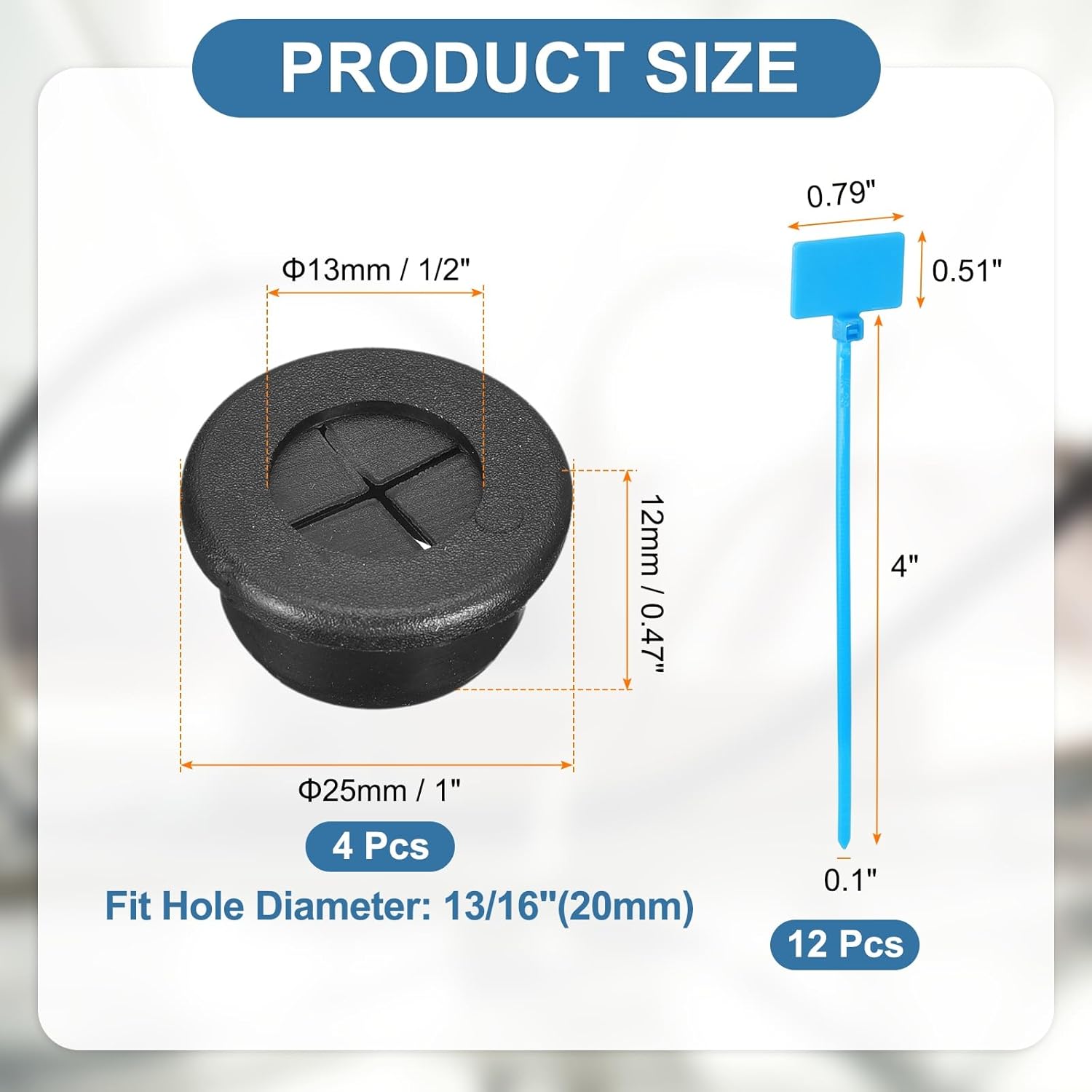 uxcell 4Pcs Cable Cord Grommet, 13/16"(20mm) Rubber Desk Grommets Wire Pass Through Hole Cover with Marked Cable Ties for Home Office Cable Wire Protection, Black
