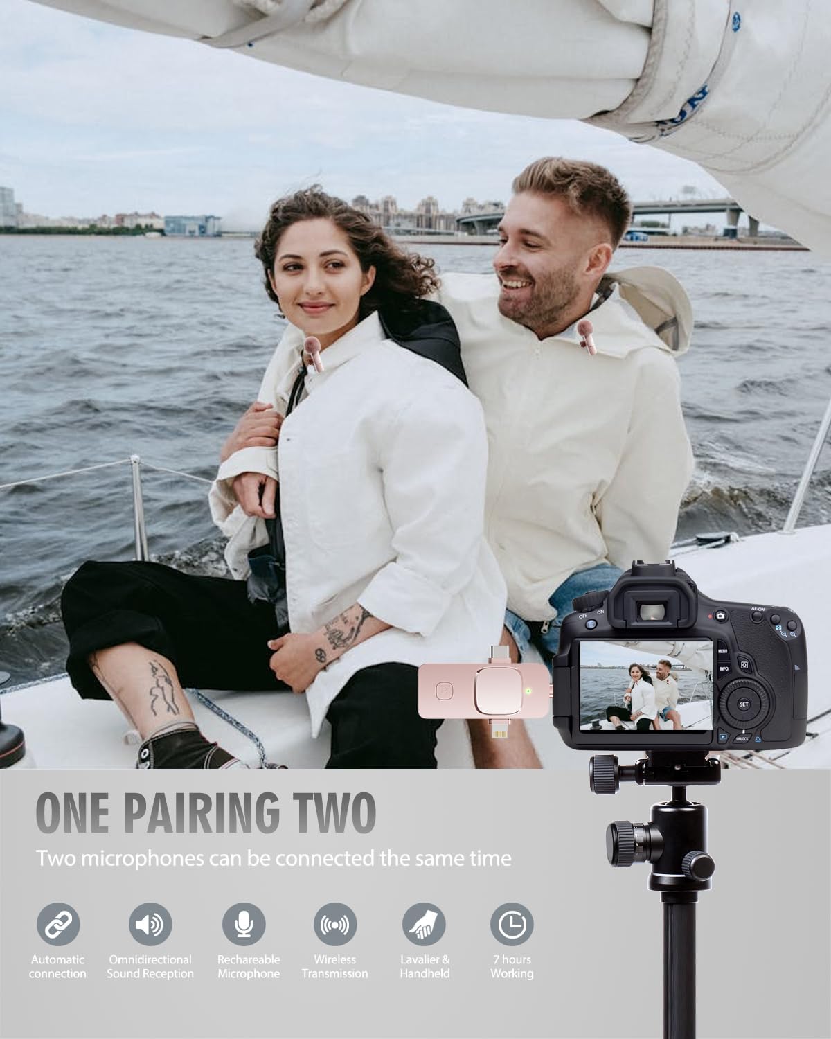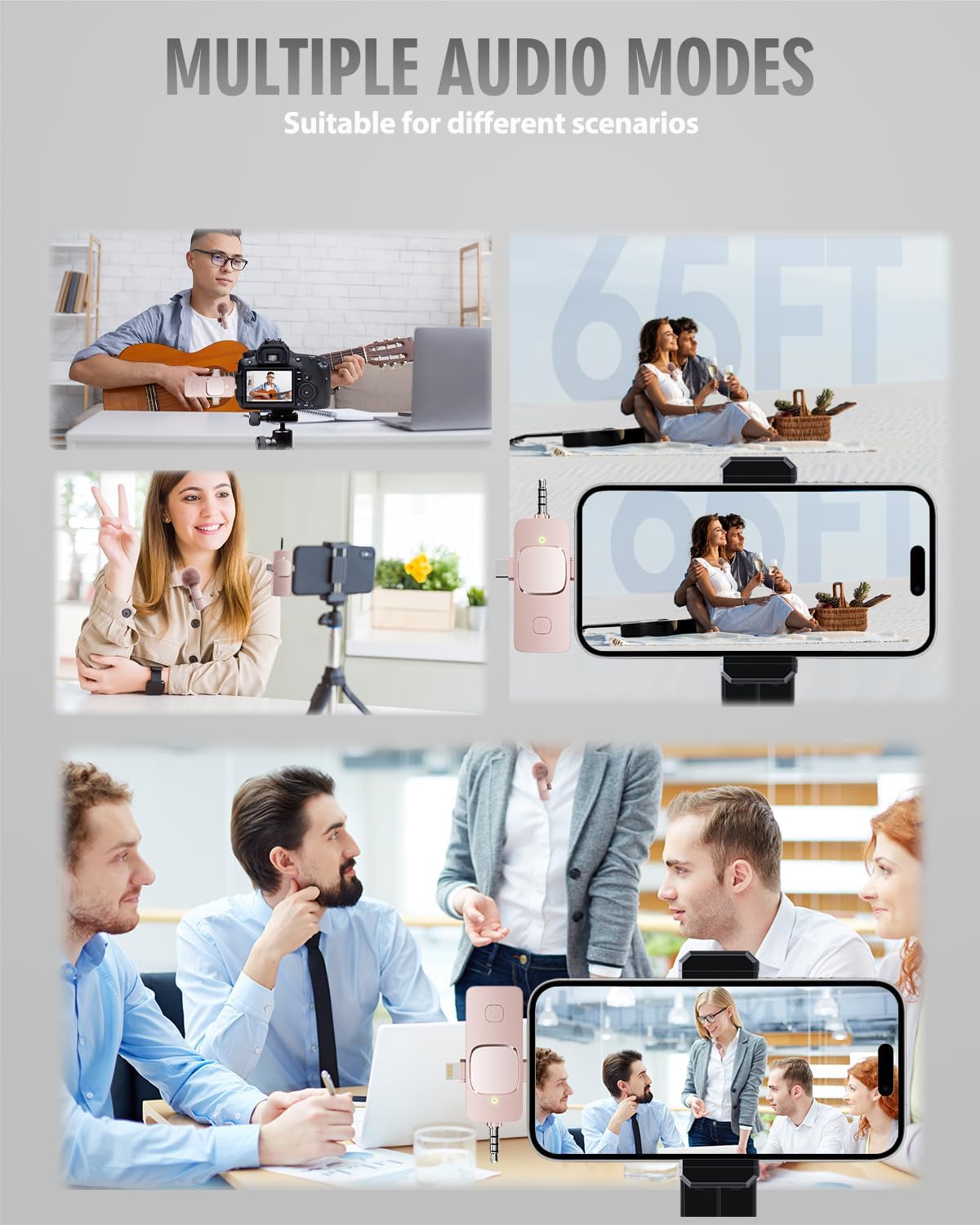 PQRQP 3 in 1 Wireless Lavalier Microphone for iPhone, iPad, Android, Camera, Mini Microphone, 7-Hour Battery, High Definition Sound Quality for Interview, Video Podcast, Vlog (Pink)