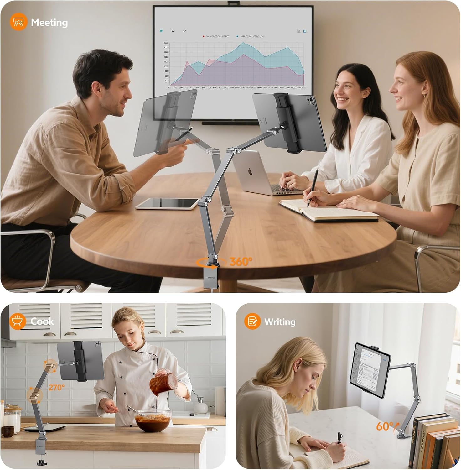 - 360° Adjustable for Any Angle - Our ipad stand features a foldable, three-section arm and 360° rotation at both the base and clip head, easily adjust to your ideal height and angle for reading, work, or entertainment.