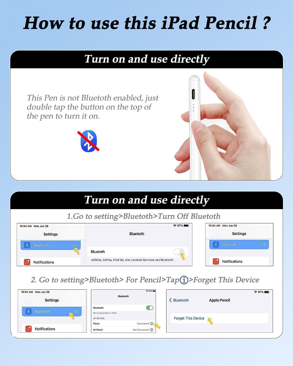 - 🖊【Touch Activated & Type-C Fast Charge】Easy to Use No Pairing Needed,Double-click the top of the ipad stylus to turn on/off easily without connecting Bluetooth.Stylus Pen with the USB-C charging port and fully in 25mins and allows 10 hours of continuous use,auto"sleep mode"after 5 mins of inactivity help conserve battery power