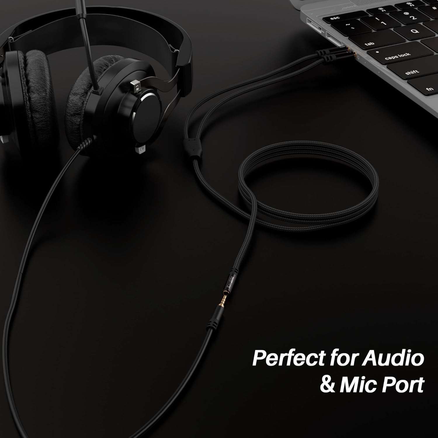 - 2 to 1 Mic Headphone Splitter: This 1/8inch splitter cable has a TRRS 3.5mm female connector, splits into two TRS 3.5mm male ports, which can connect headphones with 4-pole 3.5mm TRRS plugs to PCs or laptops with separate audio and microphone jacks. It is the perfect solution for online gaming or use with VOIP applications such as Skype, MSN Messenger, voice, online courses, and team meetings.