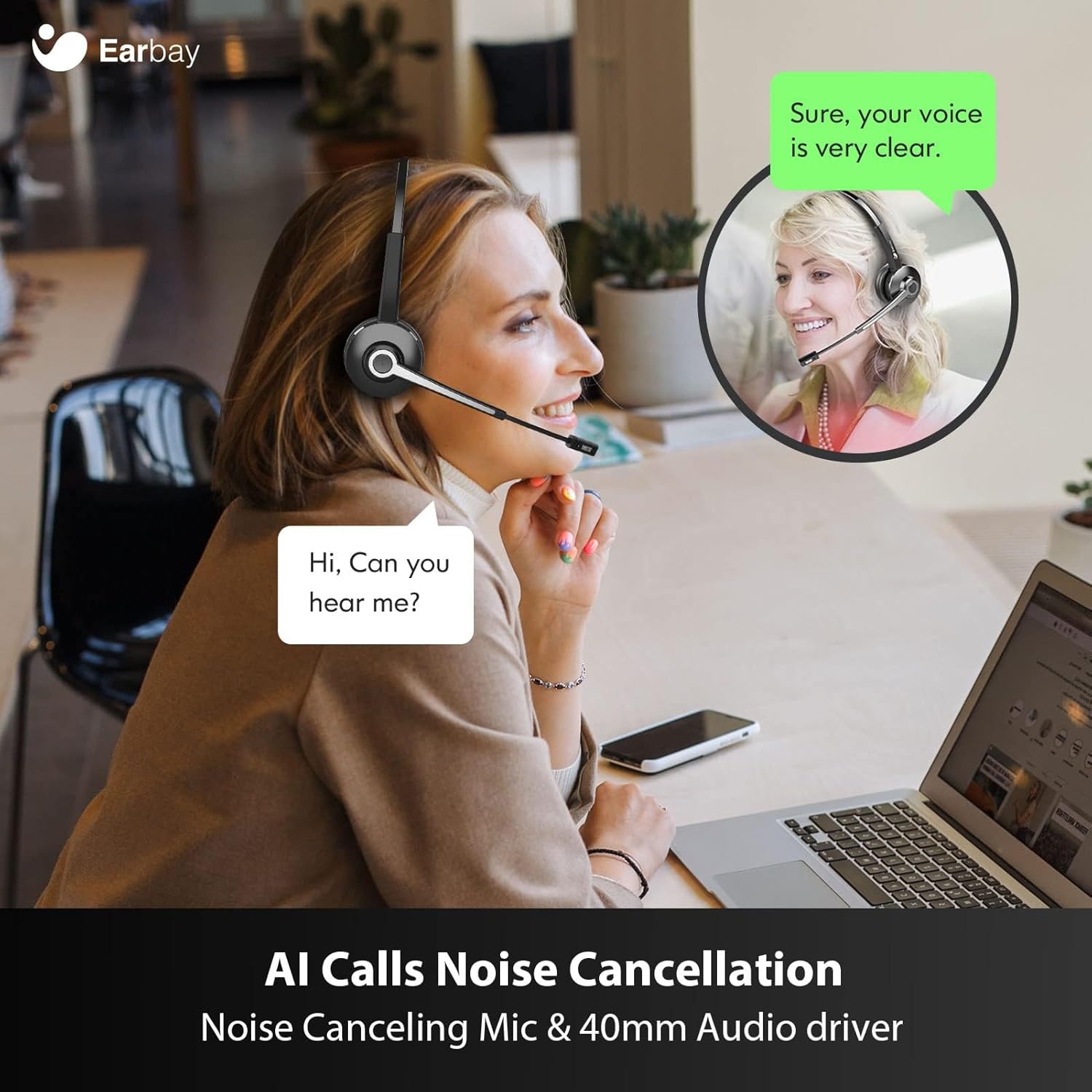 Earbay Trucker Bluetooth Headset, Wireless Headphones with Mic Mute & USB Dongle, Wireless Headset with Microphone Noise Canceling & Charing Base for Work/PC Computer/Phones/Office/Meeting