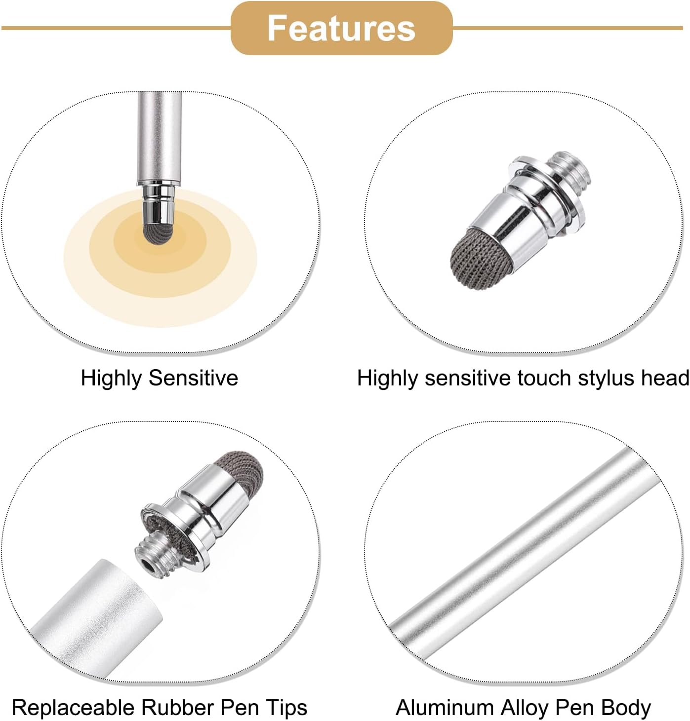 - Highly sensitive and high-precision stylus touch pen, does not harm the capacitive touch screen of mobile phone, tablets, etc; Replaceable pen tips, which does not require tools during replacement, are convenient, quick, and easy to operate; Aluminum alloy pen body, elegant and beautiful; With a clip, stylus pen is easy to carry