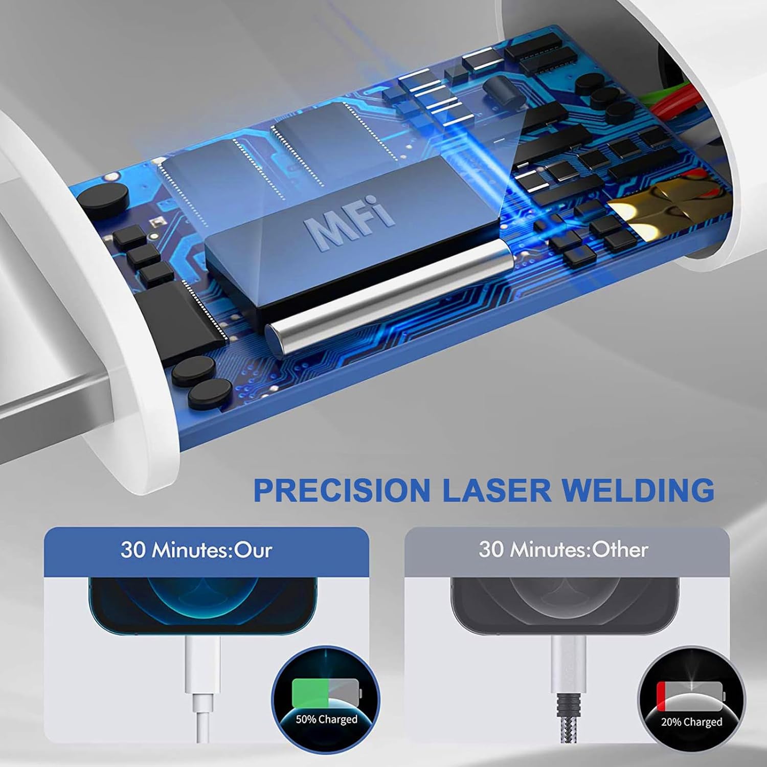 - [Safe iPhone 13 charger Fast Charging] The Power Delivery Wall Charger for iPhone owns bulit-in multi-protection system, avoiding from over-voltage, over-charge, over-heat, etc. The smart chip including in the MFi certified lightning cable match the current required by the for you device automatically, charge your iPhone/iPad device fast, safely and steadily