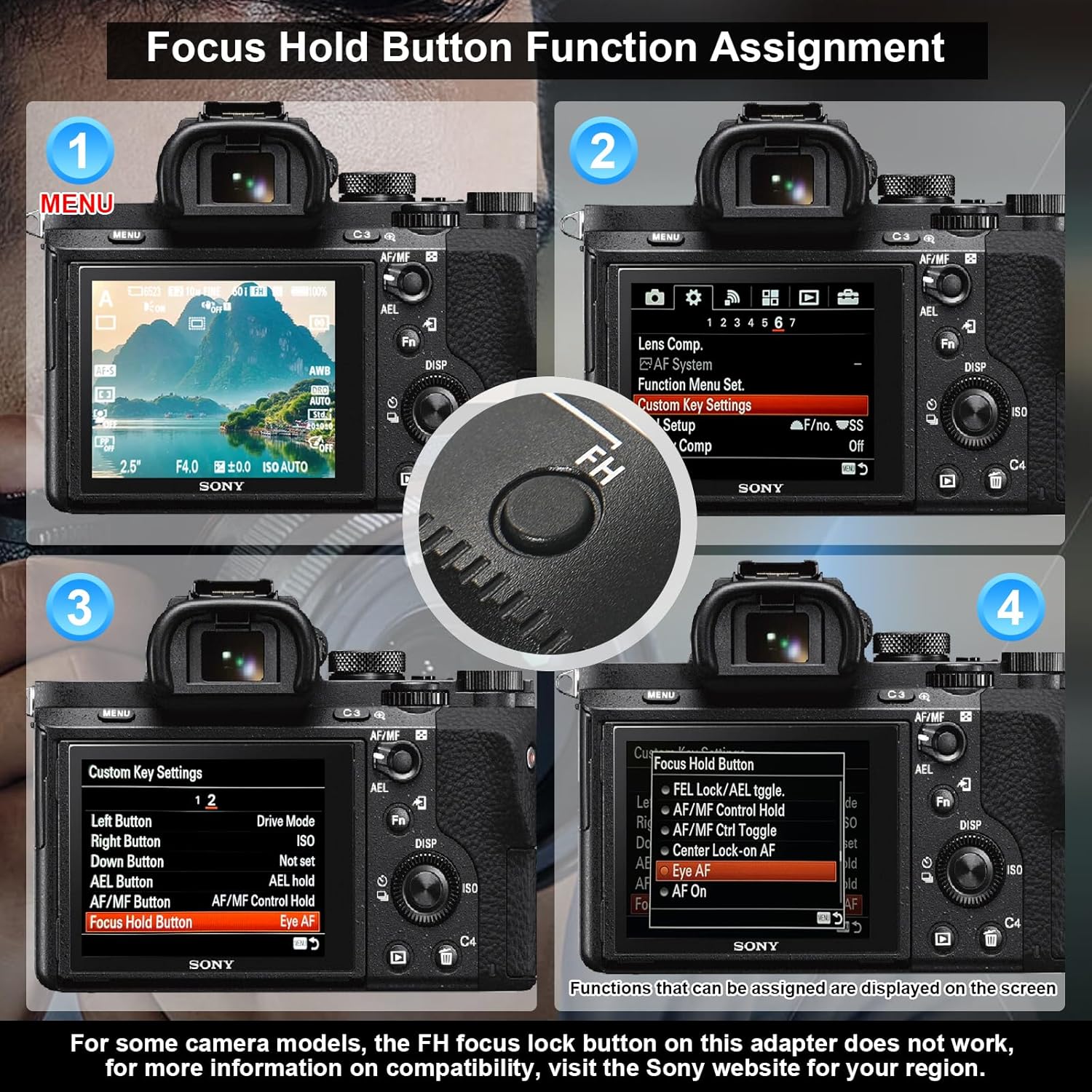 - The FH Focus Hold Button function can be customised to assign functions, and you can view the functions that are allowed to be assigned on the camera, viewing steps: MENU → (Custom Settings) → [Custom Key Settings][Focus Hold Button] → desired setting.