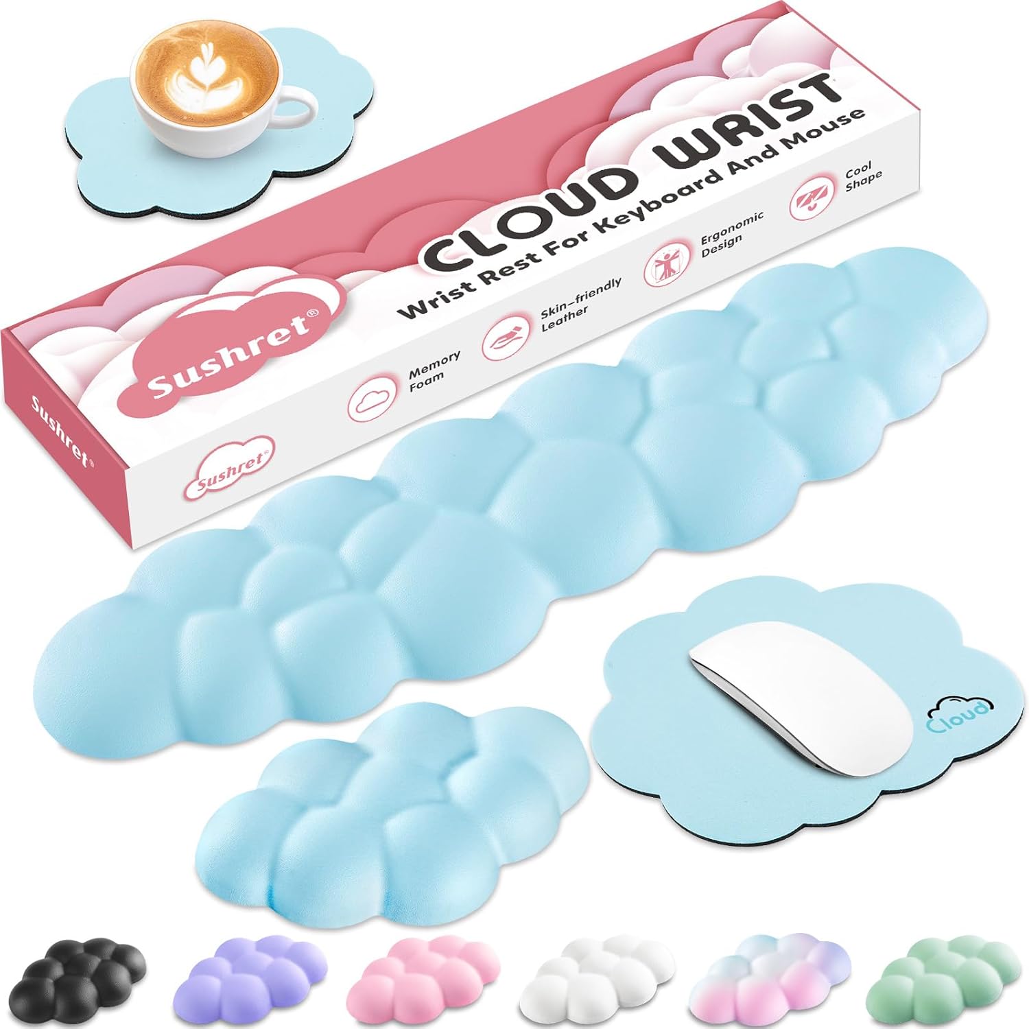- 4-in-1 Cute Desk Accessory Set: Includes a keyboard wrist rest, mouse wrist rest , mouse pad, and a matching cloud coaster. This complete four-piece set offers ergonomic comfort and comes in a stylish gift box, making it suitable for desktop and laptop setups—whether for gaming, home office, or as a thoughtful gift