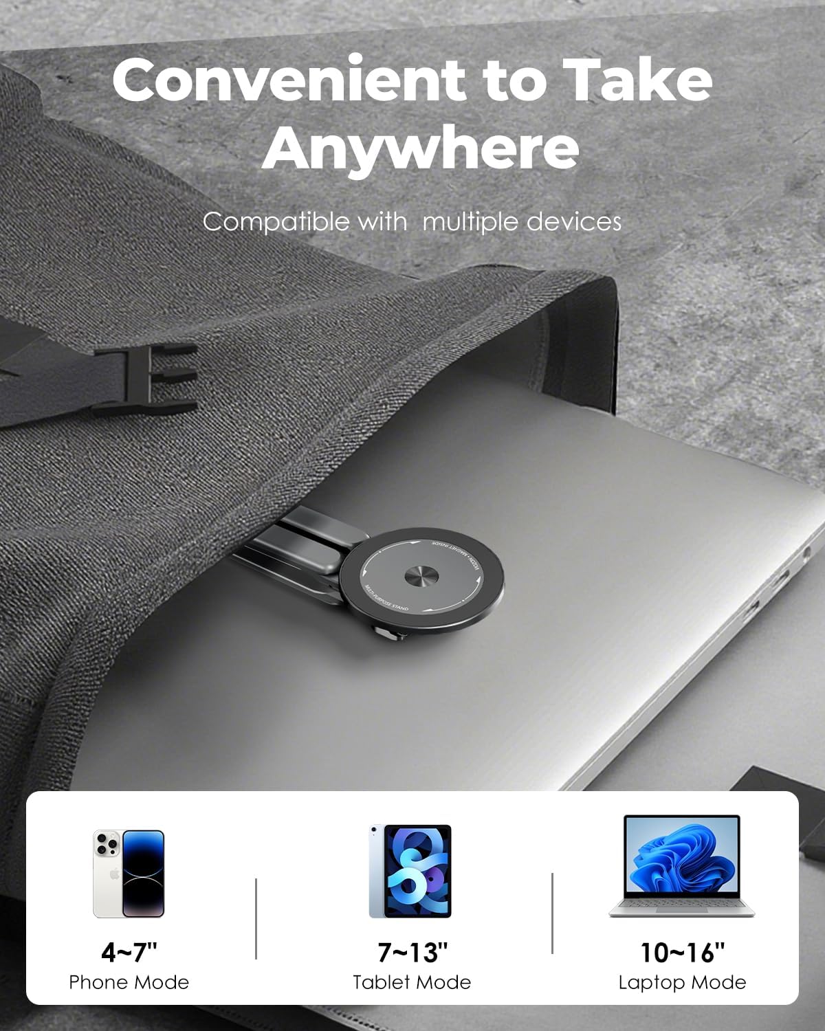 - 【3-Way Multi-Purpose Design – Portable Laptop Stand, Phone Holder & Tablet Holder】 Use it as a foldable laptop stand (compatible with 10–16 inch laptops), a desktop magnetic phone stand (fits 4–13 inch smartphones/tablets), or a hanging magnetic stand for travel on airplanes, buses, or trains. One stand solves your multi-device holding needs anywhere.
