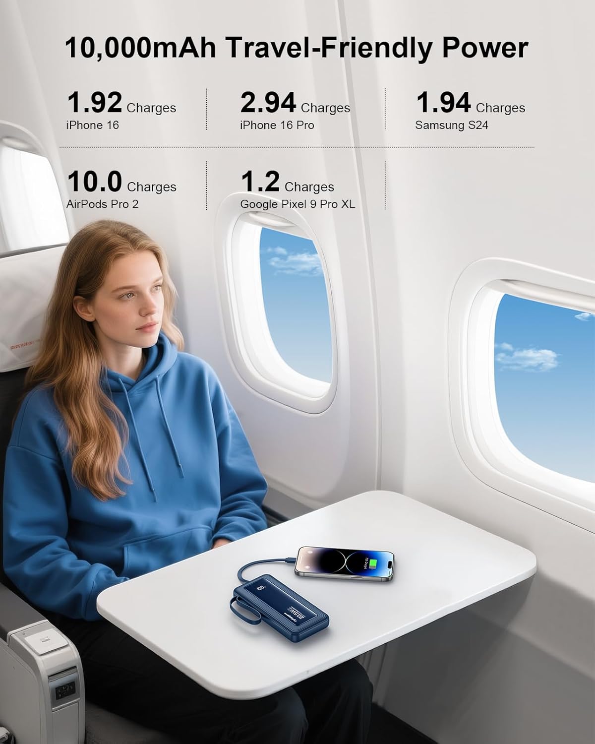 Portable Charger with Built in Cables, Slim 10000mAh Fast Charging 22.5W Power Bank USB C LED Display Battery Pack 6 Outputs & 2 Inputs for iPhone Samsung Pixel LG Moto iPad