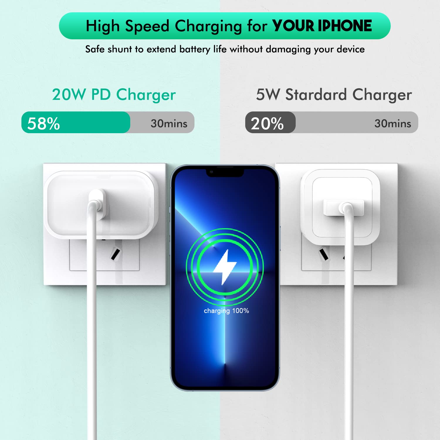 - ⚡【3X Ultra-Fast Apple Chargers for iPhone】2Pack 20W PD USB C iPhone Fast Charger makes efficient use of half an hour to fully charge your iPhone 14 or iPhone 13 up to 50% in just 30 minutes,saving over 1.5hrs for you. High quality charger apple for iphone can withstand 10000+ bending and frequent unplugging and storage.