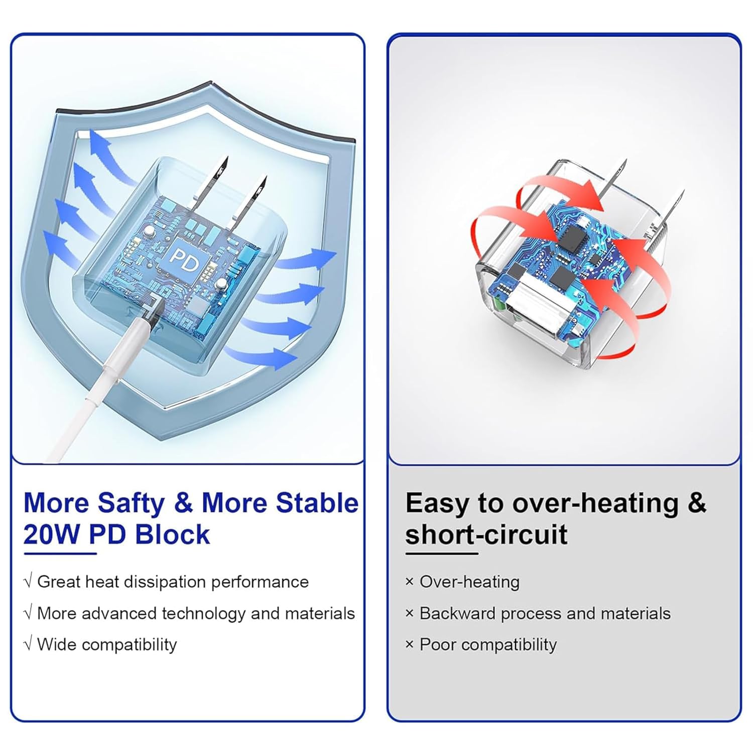 - ⚡【Safe Certified & Efficient Fast Charging iPhone】2pack fast charger iphone and 2pack usbc to lightning cable have built-in intelligent protection system, can protect against over-current,over-heat,over-voltage,over-charging,short-circuit and moisture, etc.Fully protect your life and iPhone/iPad/iPod.The tangled 3.3-foot length is convenient for use where you want.