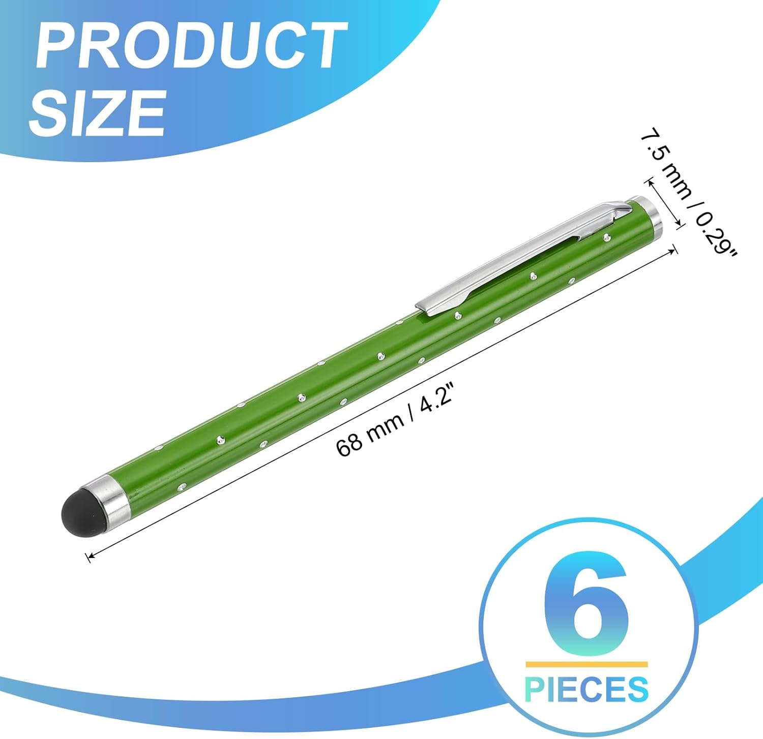 - Color: Green; Materials: Metal; Rubber; Length: 68 mm / 4.2 inch; Diameter: 7.5 mm / 0.29 inch; Packing List: 6 Pcs x Shimmering Crystal Capacitive Pen