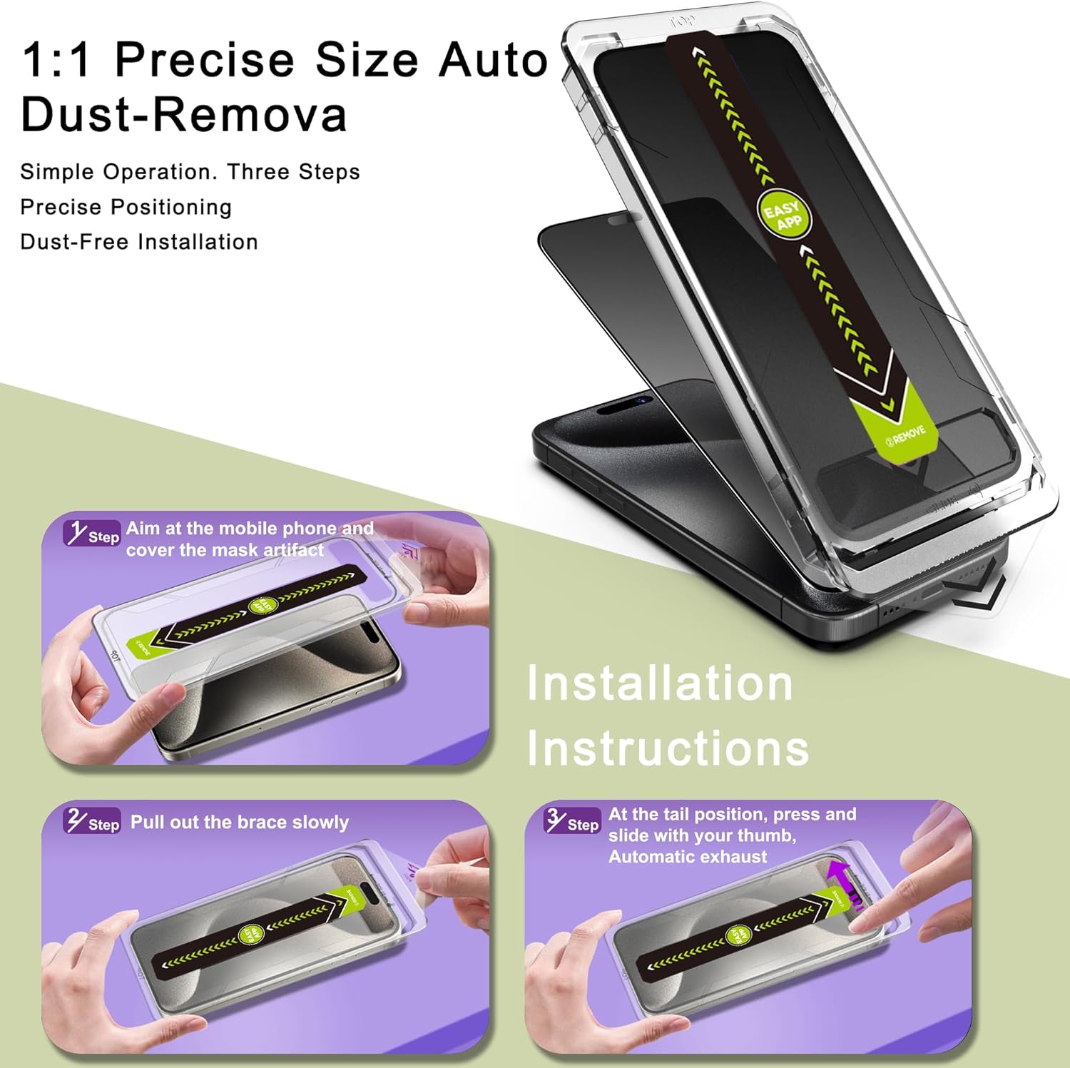 - Auto Dust Removal & Easy Installation: The SY SHANGYAN Matte Privacy Anti-Spy Screen Protector for iPhone 15 Pro features advanced auto dust removal and self-aligning technology for a flawless,bubble-free install every time.Just place the frame,pull the tab,and press to push out any air bubbles.Installation is quick,easy,and hassle-free.For best results,watch our step-by-step installation video before applying
