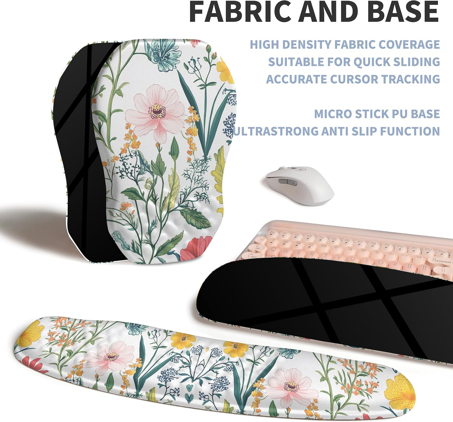 2-in-1 Ergonomic Set, Wave Keyboard Wrist Rest and Massage Slope Mouse Pad Wrist Support, Rebound Memory Foam for Relieve Carpal Tunnel Syndrome and Wrist Pain (Pink Flowers)