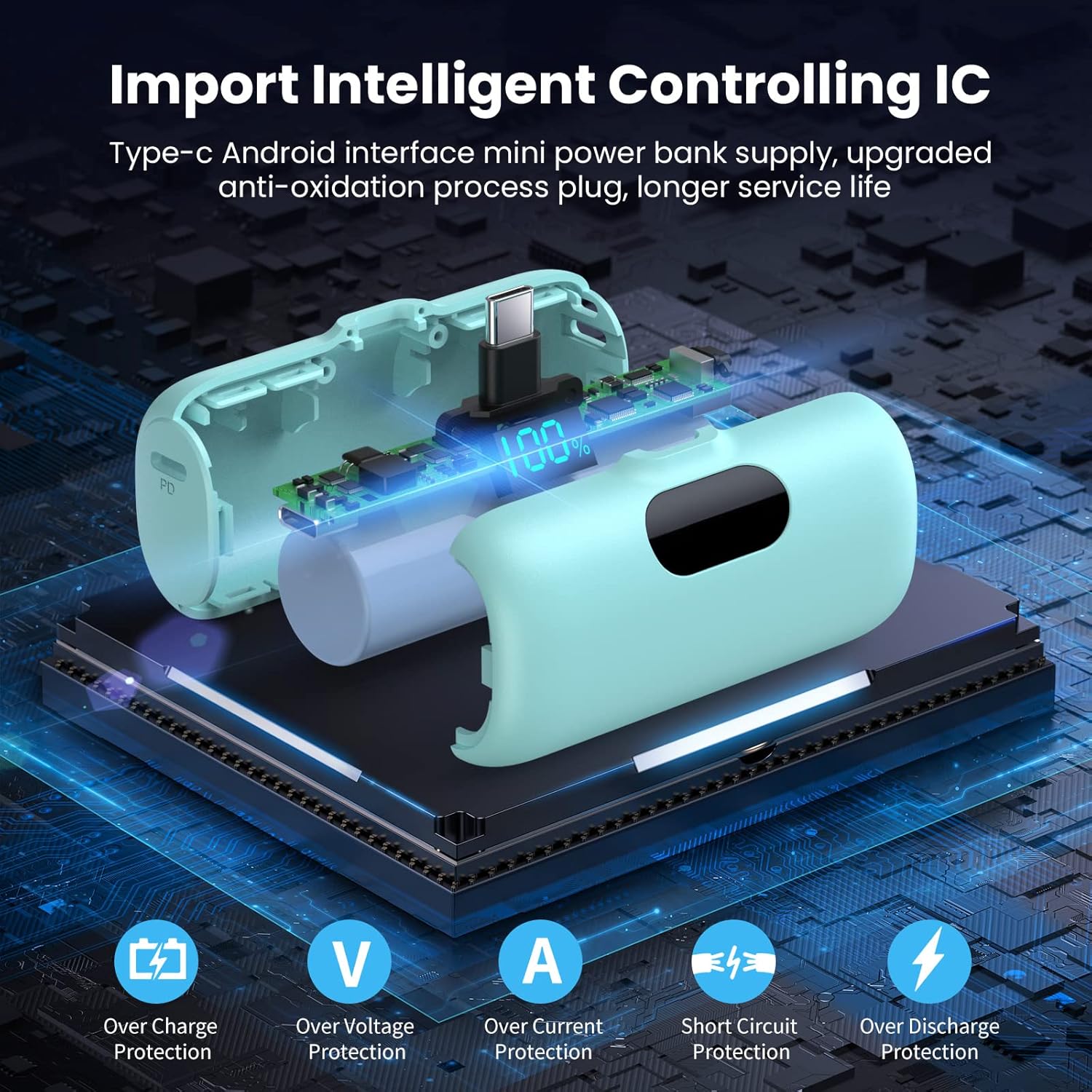 - 【Small Yet Powerful】Despite its small size, the mini portable charger features a 5000mAh capacity that can charge your phone 0.8-1.5 times on a full charge, covering your daily charging needs. Its built-in USB-C connector eliminates the need for extra cables, allowing you to easily charge your phone directly from the charger without carrying additional accessories.