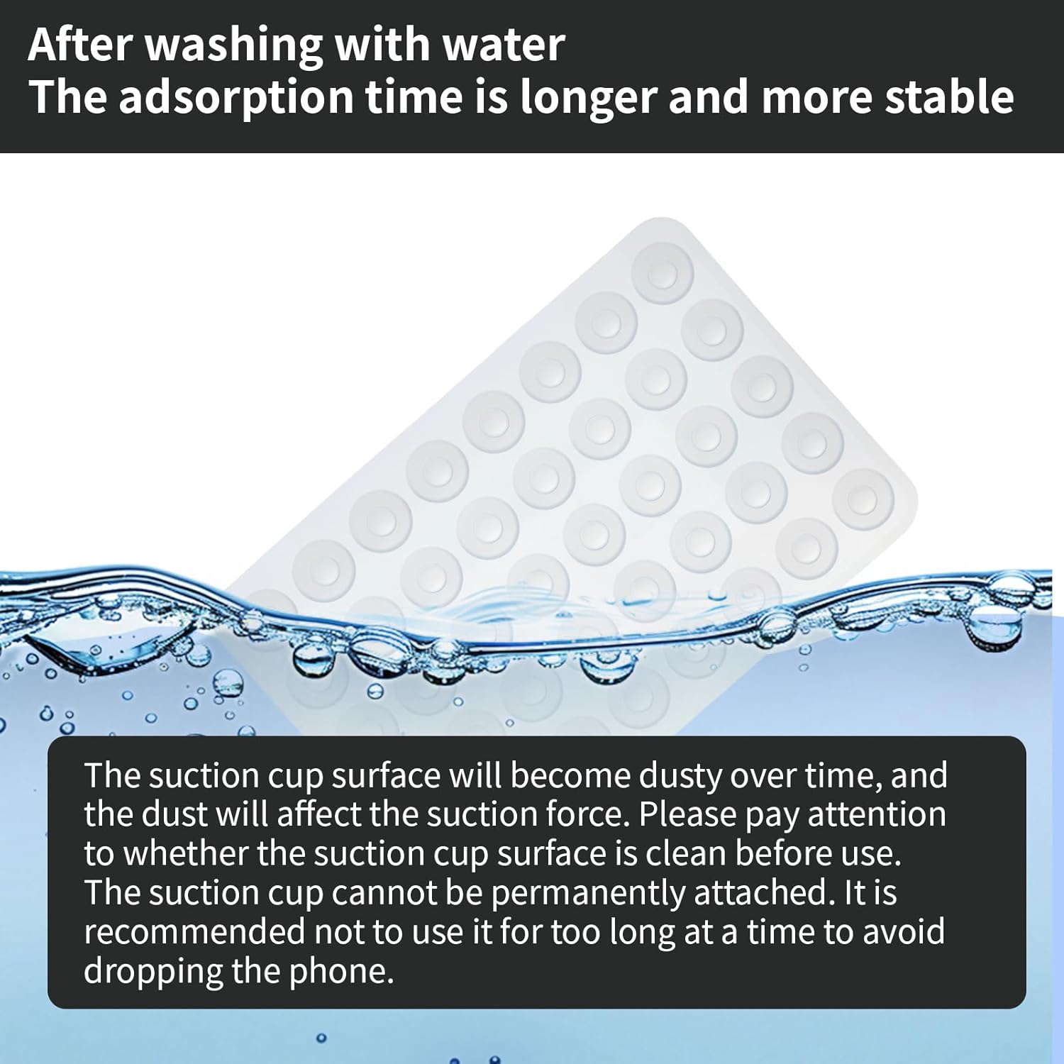 - 【Usage Tip】 The duration of suction depends on how smooth the surface is. Over time, the grip’s suction strength may gradually weaken. To prevent your phone from falling, we recommend using it for no more than 30 minutes at a time.