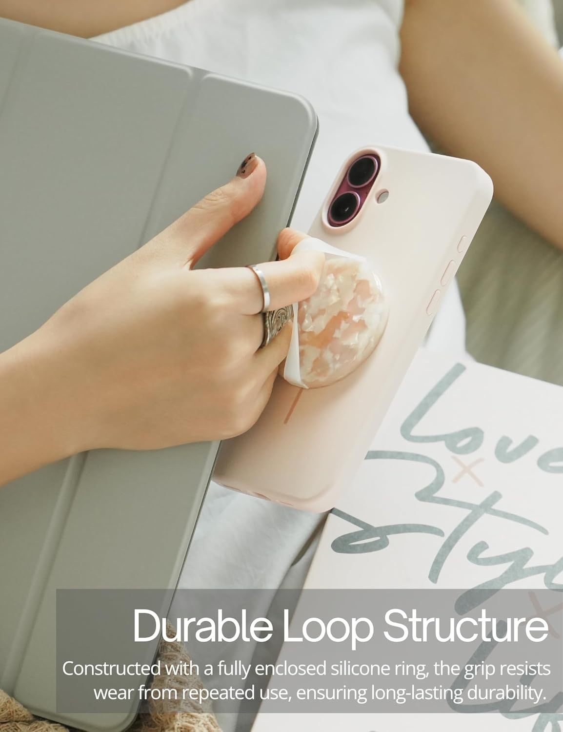 - [Durable and Comfortable Loop Design] – Constructed with a fully enclosed silicone loop, the phone grip resists wear from repeated use, ensuring long-lasting durability. The soft, high-grade silicone finger loop offers a comfortable, slip-free grip – ideal for one-handed use and easy to carry in your pocket.
