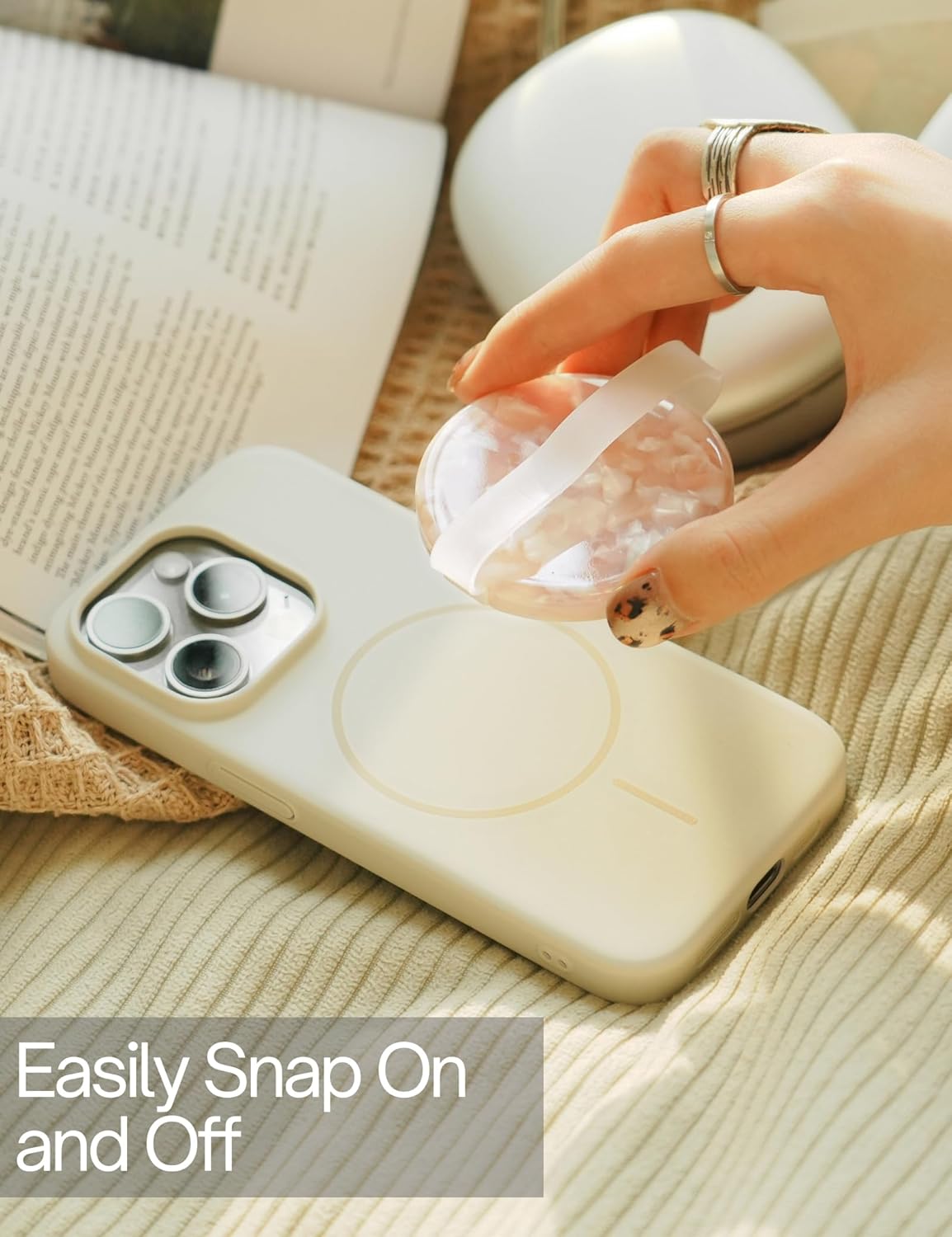 - [MagSafe Compatible & Universal Fit] – With built-in strong magnets, the grip securely attaches to iPhone 12-16 series and MagSafe cases, easily snapping on or off for wireless charging. It also includes two Magnetic Adapter Rings, enabling most phones and cases to become MagSafe compatible.