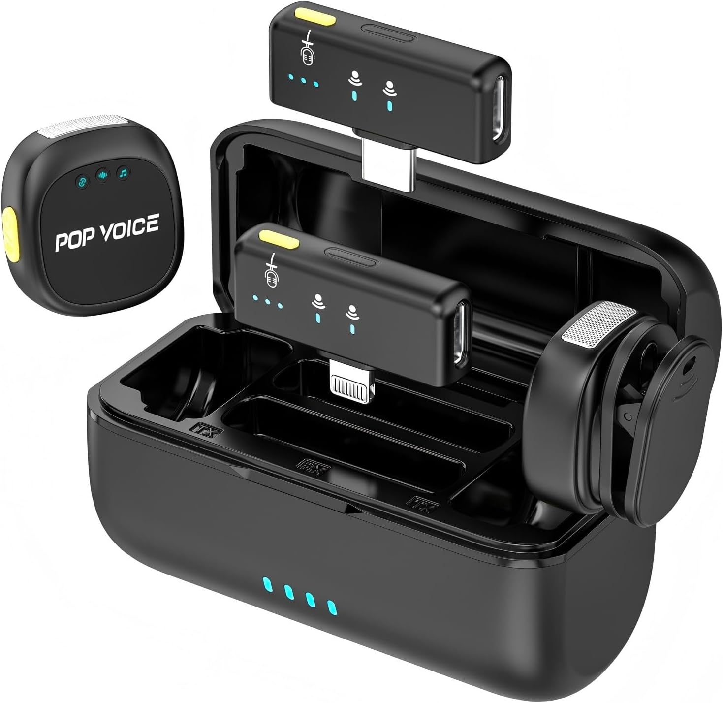 - Included Components : 1 × Charging Case, 1 × Lightning Receiver, 1 × USB C Receiver, 2 × Mini Clip Magnet, 2 × Windscreen, 1 × USB-C Charging Cable, 2 × Transmitters 1 × Charging Case, 1 × Lightning Receiver, 1 × USB C Receiver, 2 × Mini Clip Magnet, 2 × Windscreen, 1 × USB-C Charging Cable, 2 × Transmitters
