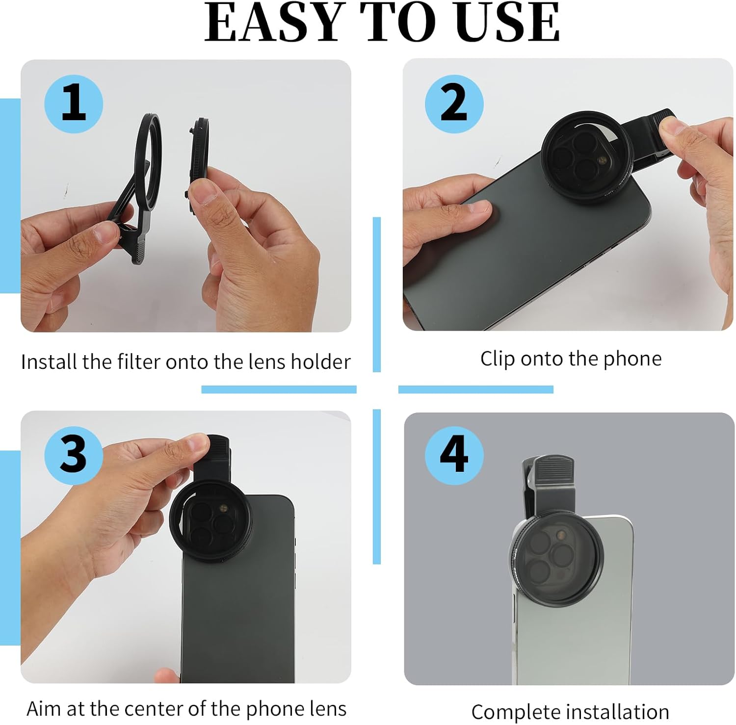 - Universal Clip-On Design: Our upgraded spring-loaded clip fits 6.1″–6.9″ smartphones, phone CPL filter compatible with iPhone 16/15/14/13 series, S24, Pixel 8, and other leading models. Scratch-resistant silicone pads protect your device's finish, and the anti-slip grip holds steady even during time-lapses or action shots