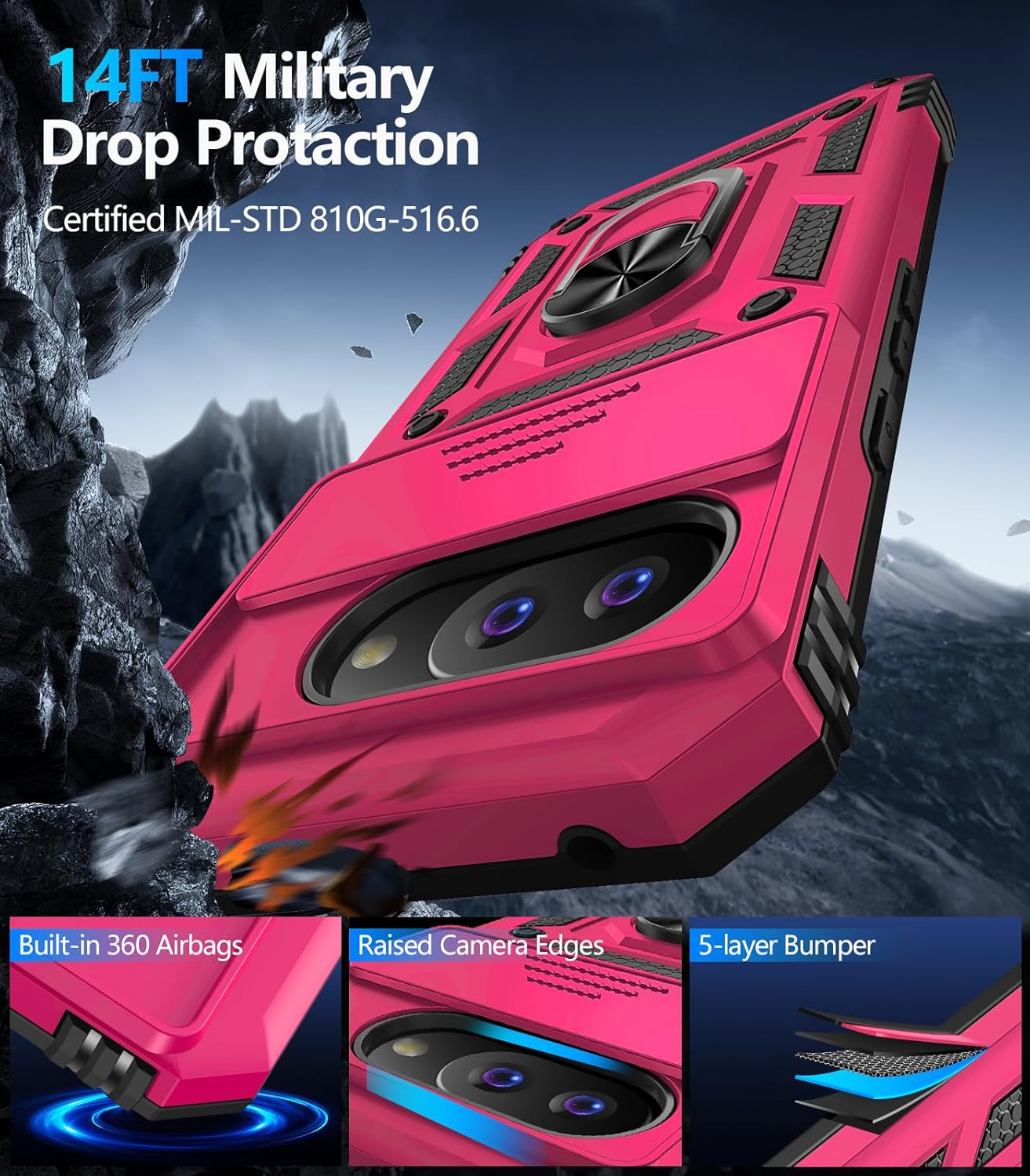- 【Full Body Protection】For Google Pixel 9A Phone Case is military-grade drop protection. It has exclusive Shock 360° airbags around edges and strong TPU rubber bumpers on the outside edges for shock absorption if dropped. The internal air pad corners as bumpers are rounded and bubble out safely, giving extra room against corner shattering. What's more, Slide Camera Lens Cover, 1.5 mm bezels over the screen and 0.5 mm raised corner lips on the back provides extra and comprehensive protection.