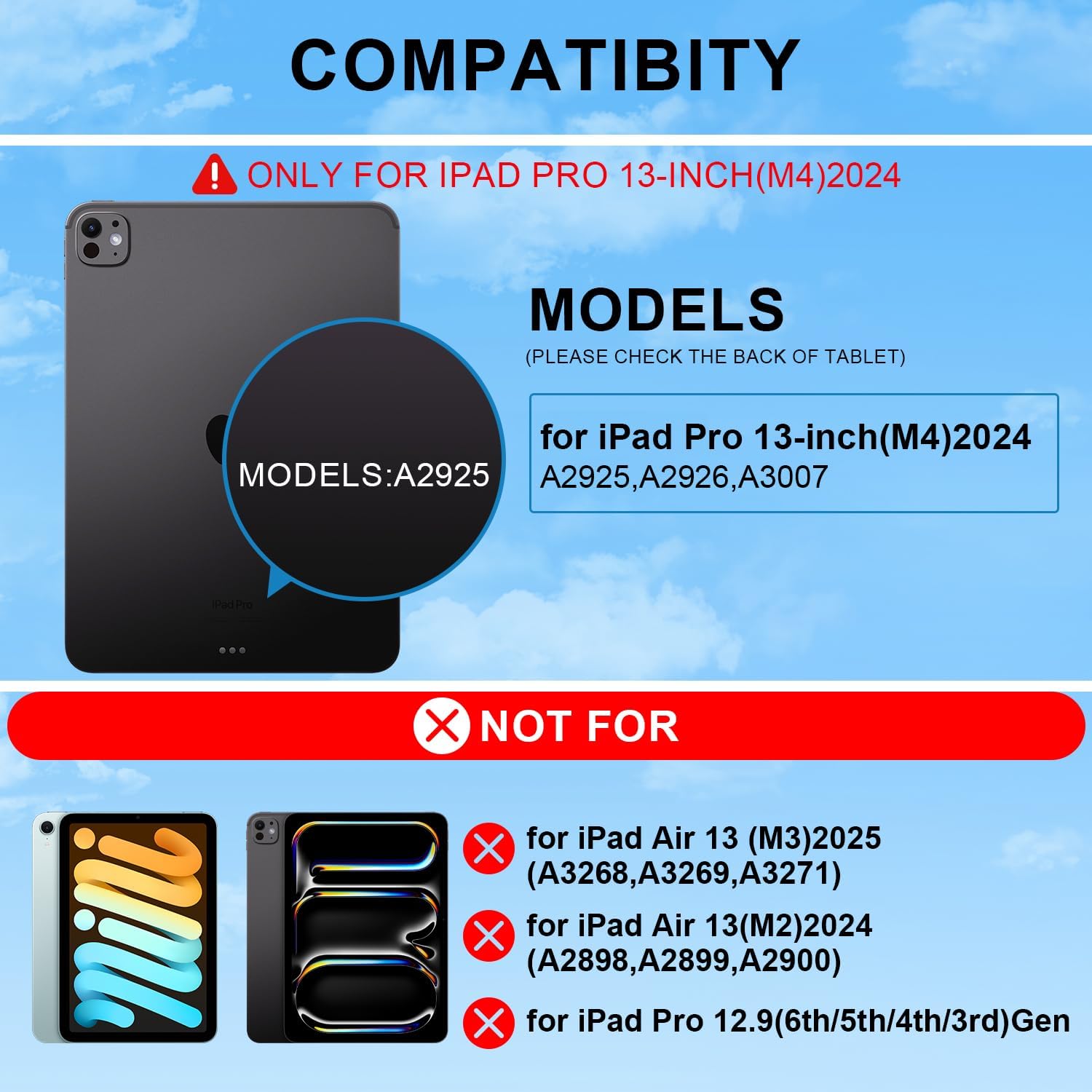 - Compatibility: This premium slim keyboard case is perfectly compatible with iPad Pro 13 inch (M4) 2024 experience with our versatile keyboard case. models include 2024 iPad Pro 13 inch(A2925,A2926,A3007; NOTE:NOT FIT FOR IPAD AIR 13(M3 2025 /M2 2024),We’re happy to help! Reach out to us if you need to check compatibility