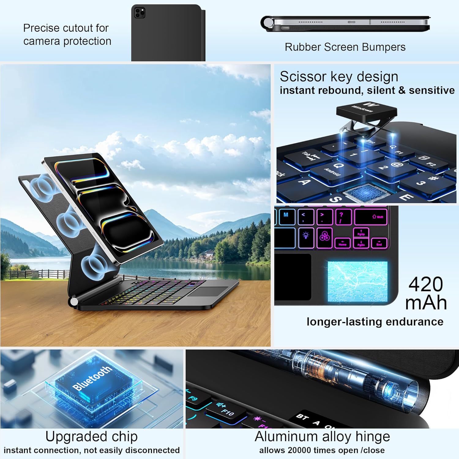 - 7-Color Backlit Keyboard Case for iPad Pro 13 M4:From dawn to dusk, adapt effortlessly! Adjusting 7 backlight and 3 levels of brightness ensures clear visuals in every setting, enhancing your immersive experience.