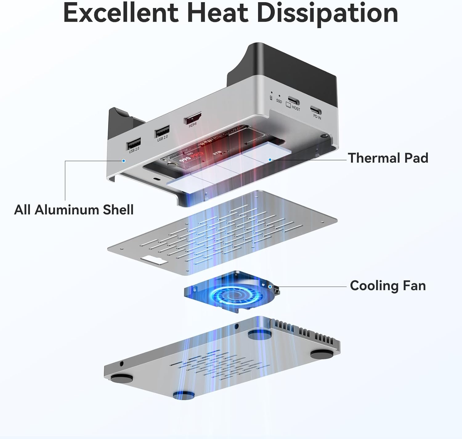 - SMART-FAN ALUMINUM COOLING: A vented aluminum shell, silicone thermal pads, and an auto-controlled PWM fan pull heat off the USB-C hub and M.2 NVMe SSD at 45 ± 3 °C, prevent throttling, and keep 10 Gbps transfers steady